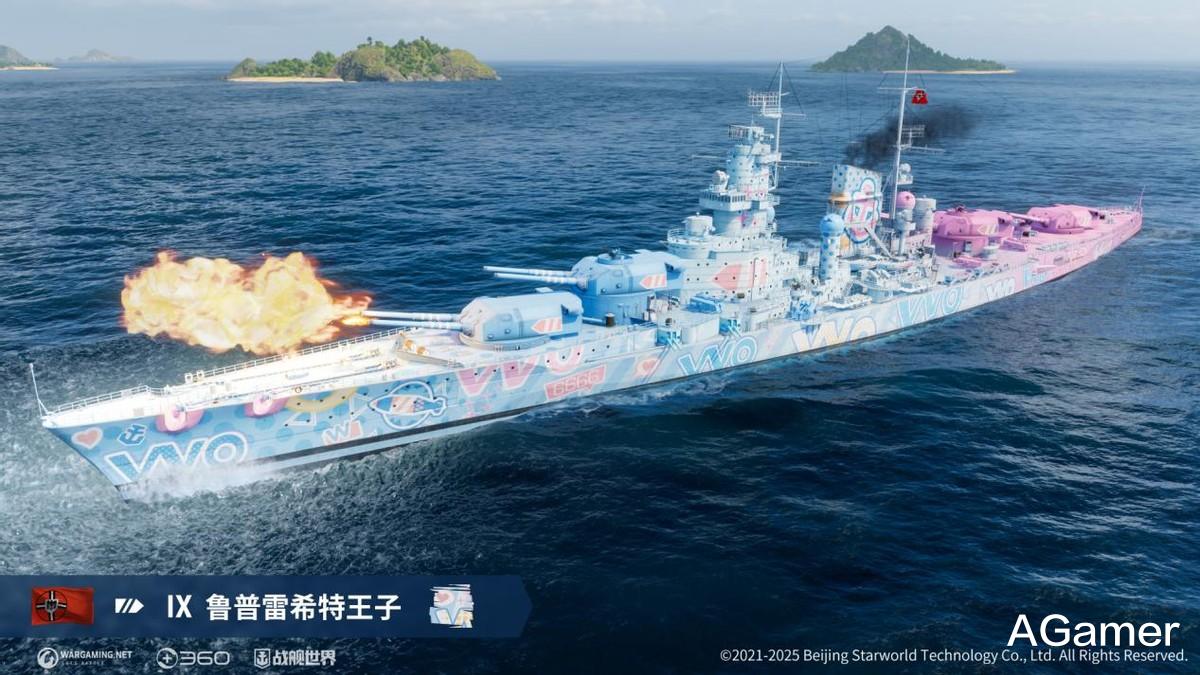 值得一提的是,今天《战舰世界》和吉祥物窝窝娘展开二期联动,刚好带来了鲁普雷希特王子的专属联动涂装“窝的世界”。粉系渐变的配色,加上可爱的文字和图案装饰,反差感拉满!