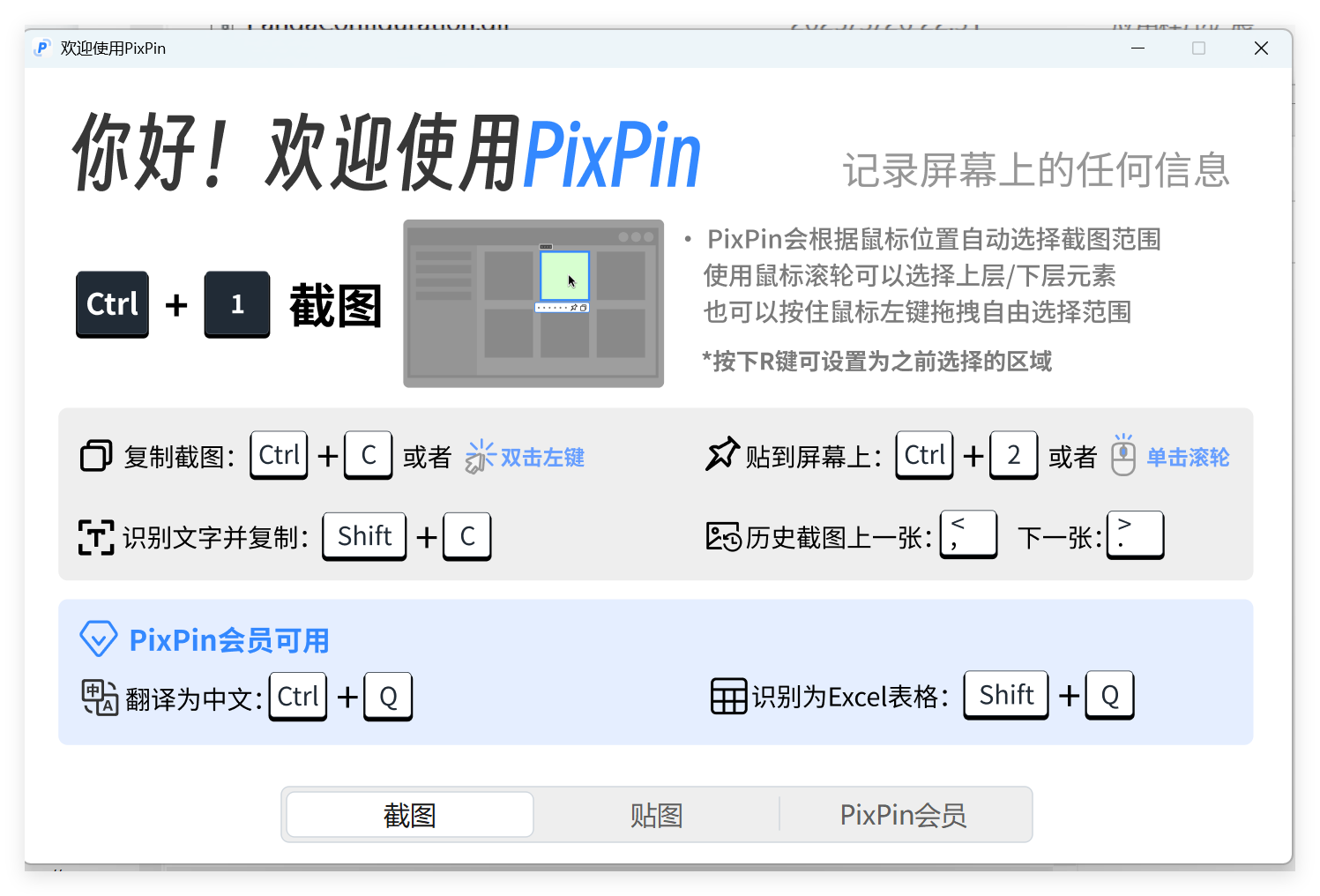Pixpin 的默认截图快捷方式为:Ctrl + 1 :