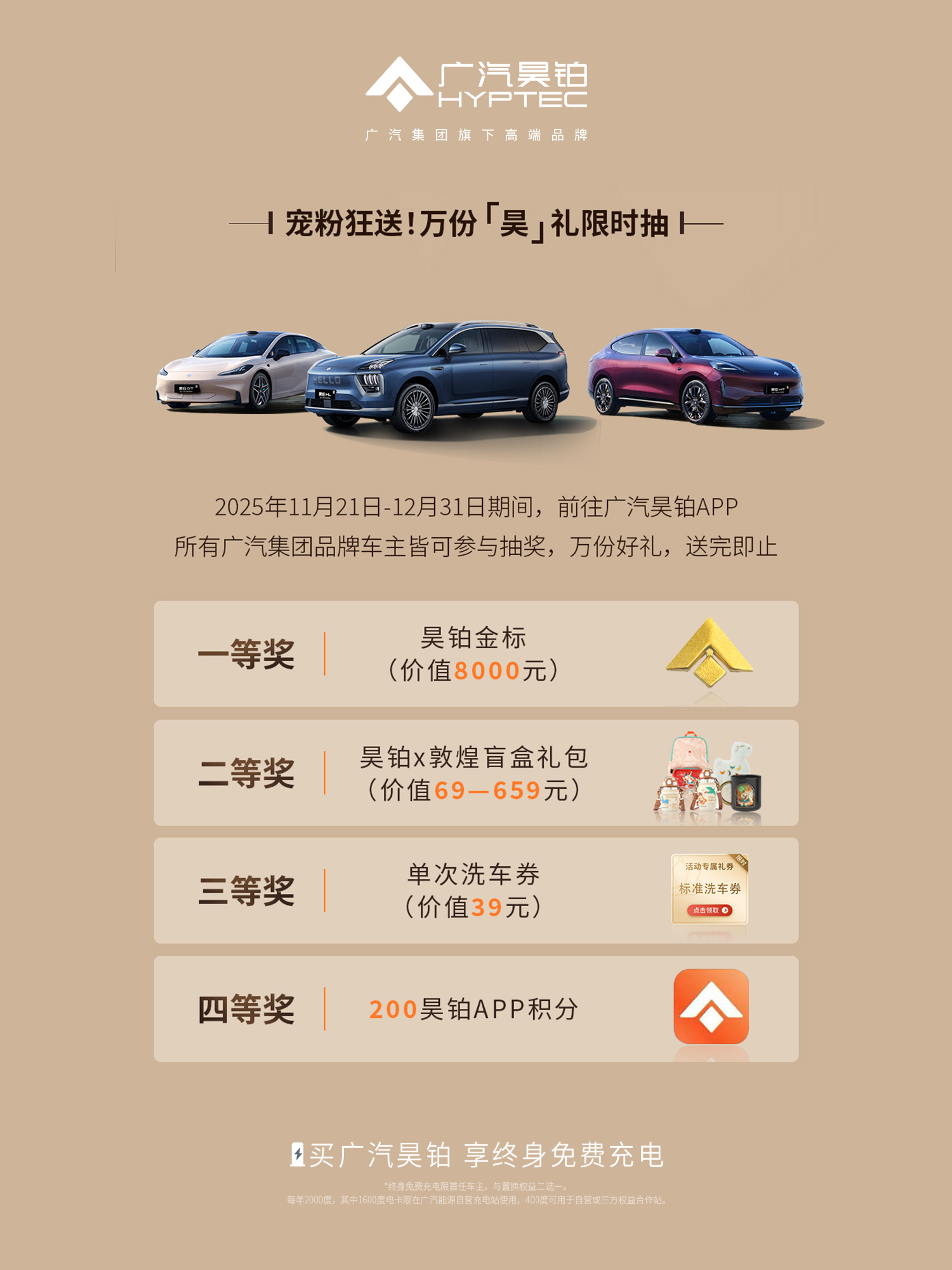 现在入手昊铂,福利权益更是诚意满满!不仅能参与下定抽奖,有机会赢取整车终身质保、价值 10000 元昊铂尊享服务包(含维保取送车、上门服务、代步车服务等),还有 3000 元、1000 元购车代金券等多重好礼。更有宠粉福利加码,2025 年 11 月 21 日 - 12 月 31 日,所有广汽集团品牌车主登录广汽昊铂 APP 即可参与抽奖,万份好礼送完即止,一等奖是价值 8000 元的昊铂金标,还有昊铂 x 敦煌盲盒礼包、洗车券和 200 昊铂 APP 积分等惊喜权益,买广汽昊铂还能享终身免费充电,用车无忧更省心~