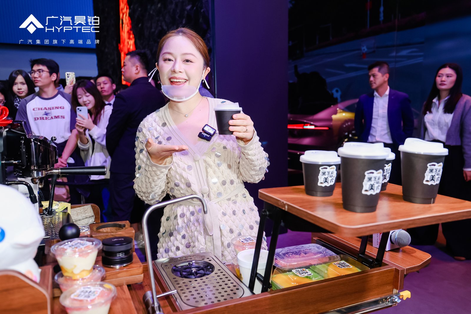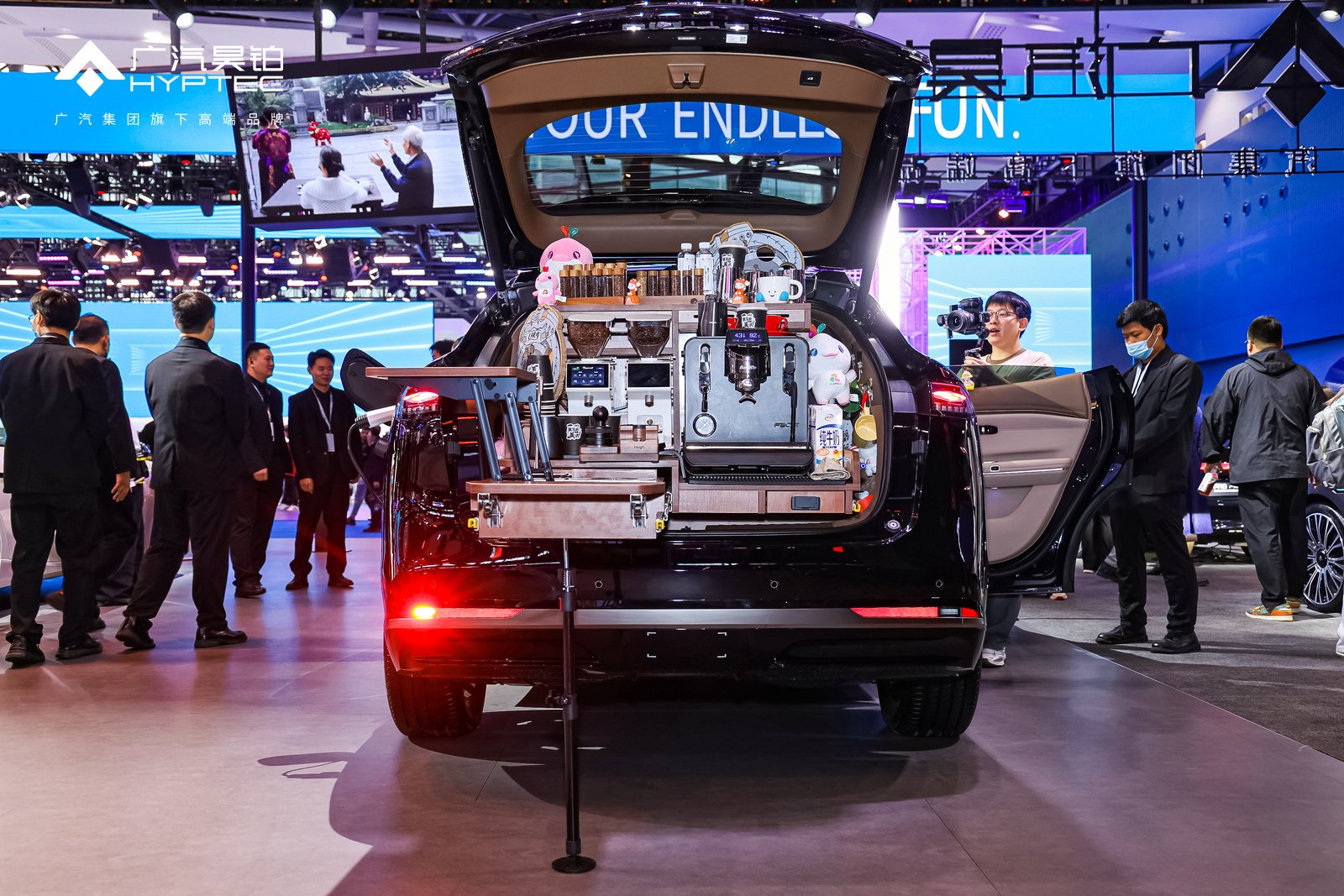 广州车展最会玩的跨界被我发现啦!美食顶流噗噗叽叽居然把一辆昊铂HT的后备箱,变成了一个飘着咖啡香气的“移动咖啡馆”!