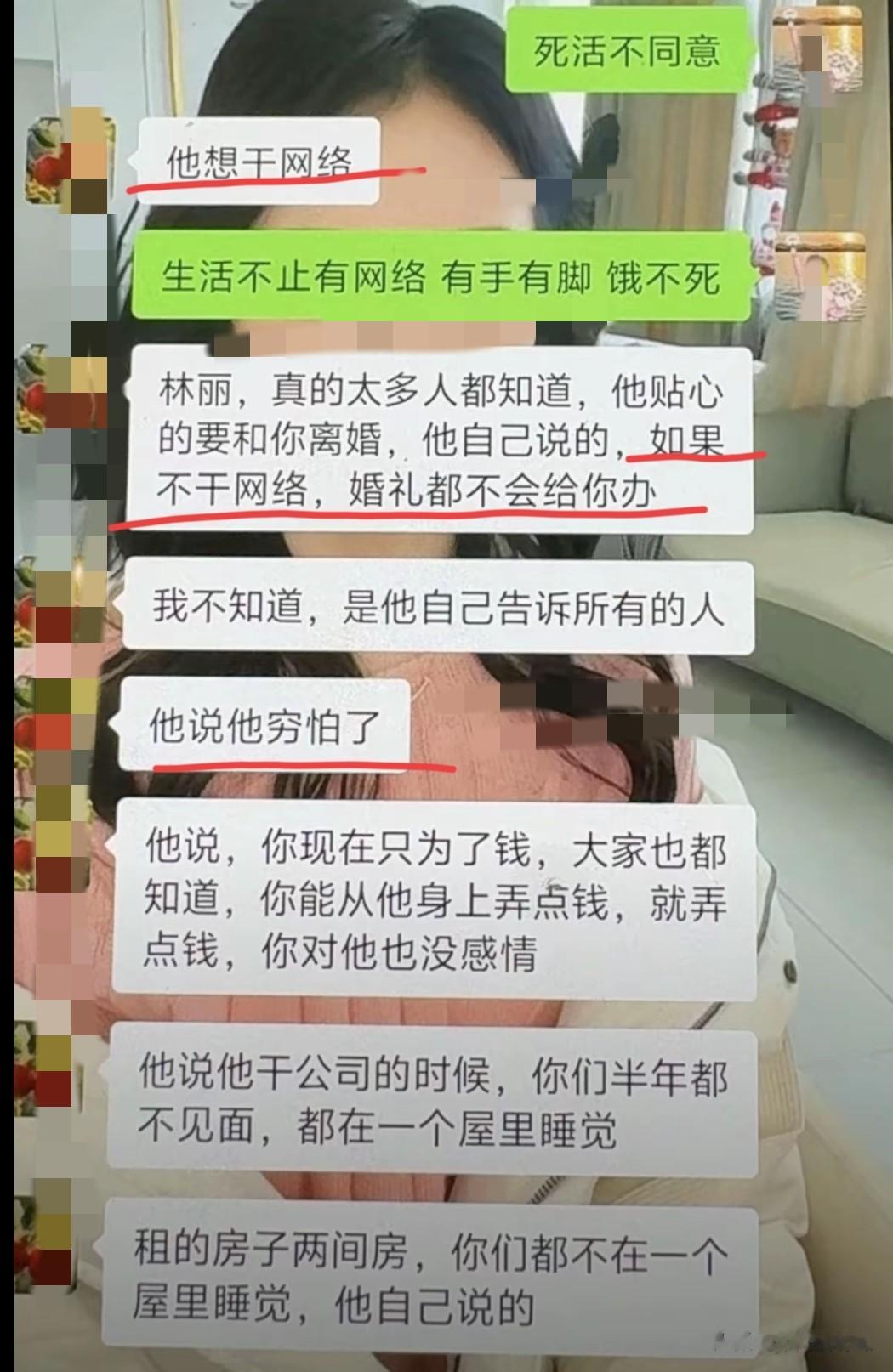 视频中的林丽住的是破旧不堪的房子,穿的是毫无质感的衣服,面色晦暗、眼神黯淡、声音无力,如果不说她是大网红的正牌妻子,还以为她是一个穷困潦倒的家庭妇女呢?