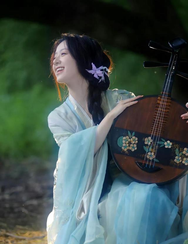 她穿着一身淡粉色的古装,头发盘成一个精致的发髻,上面插着几支玉簪。