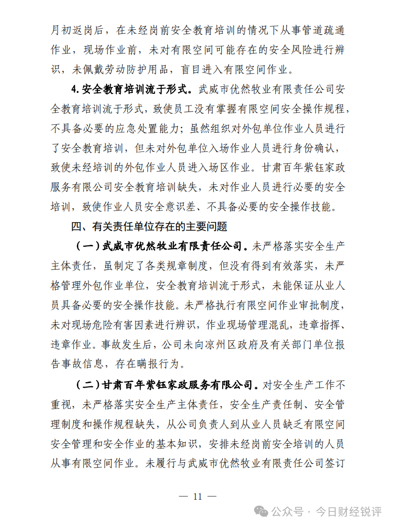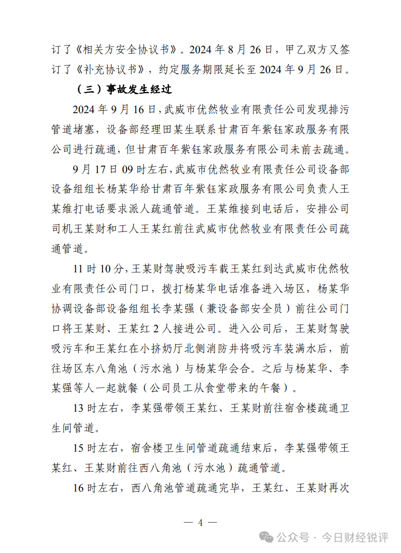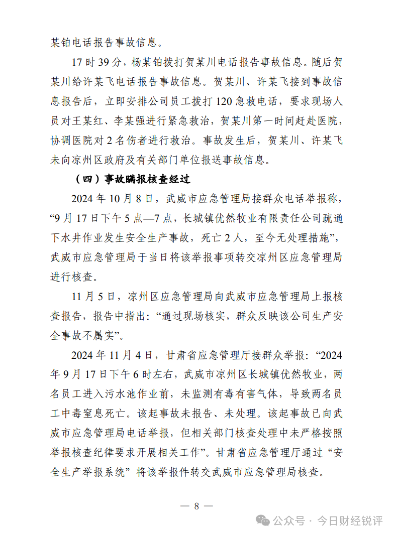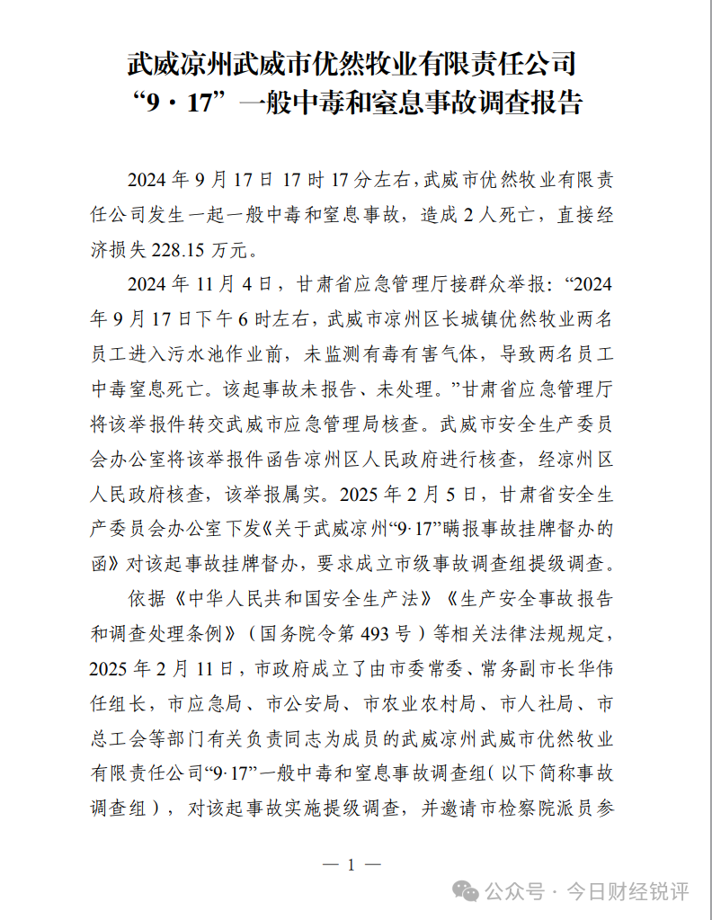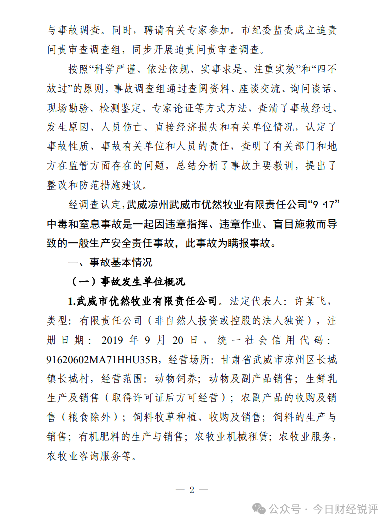近期,关于武威市优然牧业有限责任公司瞒报的一起生产安全责任事故,引发舆论关注。本报依据《中华人民共和国政府信息公开条例》依法向武威市应急管理局申请政务公开。武威市应急管理局7月28日收件后,于8月15日通过邮件向本报发送该《调查报告》的完整版,现向社会公布。2024 年 9 月 17 日 17 时 17 分左右,武威市优然牧业有限责任公司发生一起一般中毒和窒息事故,造成2 人死亡,直接经济损失 228.15 万元。2024 年 11 月 4 日,甘肃省应急管理厅接群众举报:“2024年 9 月 17 日下午 6 时左右,武威市凉州区长城镇优然牧业两名员工进入污水池作业前,未监测有毒有害气体,导致两名员工中毒窒息死亡。该起事故未报告、未处理。”甘肃省应急管理厅将该举报件转交武威市应急管理局核查。武威市安全生产委员会办公室将该举报件函告凉州区人民政府进行核查,经凉州区人民政府核查,该举报属实。2025 年2 月5 日,甘肃省安全生产委员会办公室下发《关于武威凉州“9·17”瞒报事故挂牌督办的函》对该起事故挂牌督办,要求成立市级事故调查组提级调查。依据《中华人民共和国安全生产法》《生产安全事故报告和调查处理条例》(国务院令第493 号)等相关法律法规规定,2025 年 2 月 11 日,市政府成立了由市委常委、常务副市长华伟任组长,市应急局、市公安局、市农业农村局、市人社局、市总工会等部门有关负责同志为成员的武威凉州武威市优然牧业有限责任公司“9·17”一般中毒和窒息事故调查组(以下简称事故调查组),对该起事故实施提级调查,并邀请市检察院派员参与事故调查。同时,聘请有关专家参加。市纪委监委成立追责问责审查调查组,同步开展追责问责审查调查。按照“科学严谨、依法依规、实事求是、注重实效”和“四不放过”的原则,事故调查组通过查阅资料、座谈交流、询问谈话、现场勘验、检测鉴定、专家论证等方式方法,查清了事故经过、发生原因、人员伤亡、直接经济损失和有关单位情况,认定了事故性质、事故有关单位和人员的责任,查明了有关部门和地方在监管方面存在的问题,总结分析了事故主要教训,提出了整改和防范措施建议。 经调查认定,武威凉州武威市优然牧业有限责任公司“9·17”中毒和窒息事故是一起因违章指挥、违章作业、盲目施救而导致的一般生产安全责任事故,此事故为瞒报事故。一、事故基本情况 (一)事故发生单位概况 1.武威市优然牧业有限责任公司。法定代表人:许某飞,类型:有限责任公司(非自然人投资或控股的法人独资),注册 日 期 : 2019 年 9 月 20 日,统一社会信用代码:91620602MA71HHU35B,经营场所:甘肃省武威市凉州区长城镇长城村,经营范围:动物饲养;动物及副产品销售;生鲜乳生产及销售(取得许可证后方可经营);农副产品的收购及销售(粮食除外);饲料牧草种植、收购及销售;饲料的生产与销售;有机肥料的生产与销售;农牧业机械租赁;农牧业服务,农牧业咨询服务等。 2.甘肃百年紫钰家政服务有限公司。法定代表人:王某维,类型:有限责任公司(自然人独资),注册日期:2018年4月2 日,统一社会信用代码:91620602MA7435TY69,经营场所:甘肃省武威市凉州区南关西路 146 号,经营范围:居民日常生活服务;养老服务;机构养老服务;家政服务;建筑物清洁服务;专业保洁、清洗、消毒服务;总质量4.5 吨及以下普通货运车辆道路货物运输(除网络货运和危险货物)等。(二)事故发生单位安全管理情况1.武威市优然牧业有限责任公司。法人代表许某飞,实际不参与牧场日常管理工作;时任牧场场长贺某川负责牧场全面工作;副场长杨某铂分管牧场设备部、挤奶部、饲养部、后勤部工作;安全经理赵某文负责牧场安全管理工作;时任设备部经理田某生负责设备部工作;设备部设备组组长李某强(兼设备部安全员)负责安全设施设备维修工作;设备部设备组组长杨某华负责环保设备维修工作。公司建立了安全生产责任制,制定了各项安全生产管理制度,以及危险作业安全管理规定。2.甘肃百年紫钰家政服务有限公司。法定代表人王某维负责公司全面工作,公司未建立安全生产责任制,未配备专职或兼职安全生产管理人员,安全生产各项管理制度不健全,未对从业人员进行安全生产教育培训。2023 年 8 月 27 日,武威市优然牧业有限责任公司(甲方)通过招标方式与甘肃百年紫钰家政服务有限公司(乙方)签订《管道疏通服务合同》,服务期限至2024 年8 月26日,并签订了《相关方安全协议书》。2024 年8 月26 日,甲乙双方又签订了《补充协议书》,约定服务期限延长至2024 年9月26日。(三)事故发生经过 2024 年 9 月 16 日,武威市优然牧业有限责任公司发现排污管道堵塞,设备部经理田某生联系甘肃百年紫钰家政服务有限公司进行疏通,但甘肃百年紫钰家政服务有限公司未前去疏通。9 月 17 日 09 时左右,武威市优然牧业有限责任公司设备部设备组组长杨某华给甘肃百年紫钰家政服务有限公司负责人王某维打电话要求派人疏通管道。王某维接到电话后,安排公司司机王某财和工人王某红前往武威市优然牧业有限责任公司疏通管道。 11 时 10 分,王某财驾驶吸污车载王某红到达武威市优然牧业有限责任公司门口,拨打杨某华电话准备进入场区,杨某华协调设备部设备组组长李某强(兼设备部安全员)前往公司门口将王某财、王某红 2 人接进公司。进入公司后,