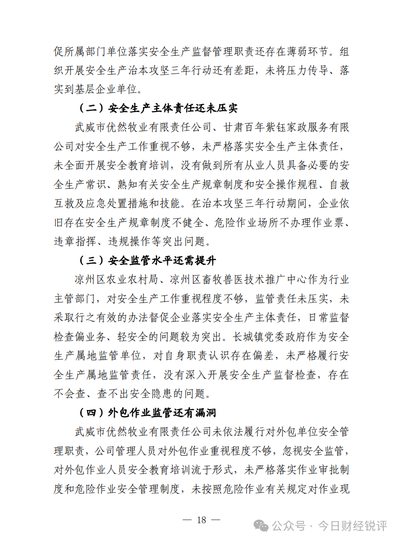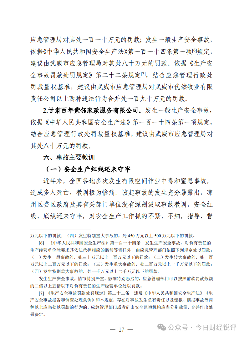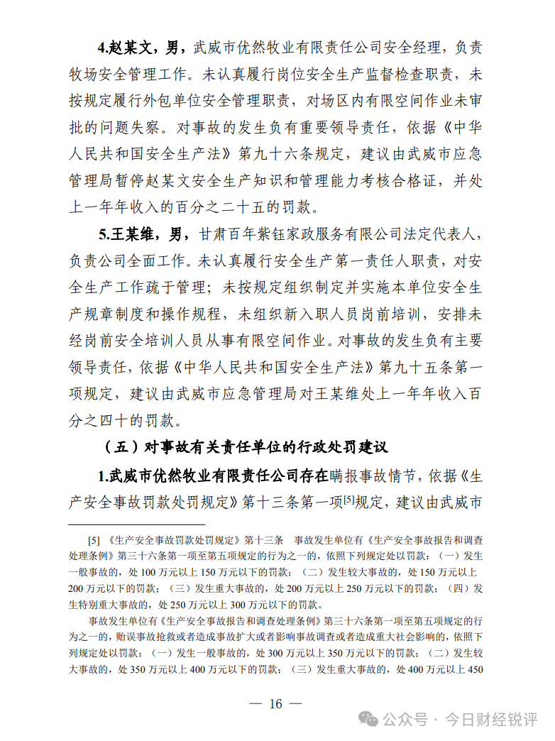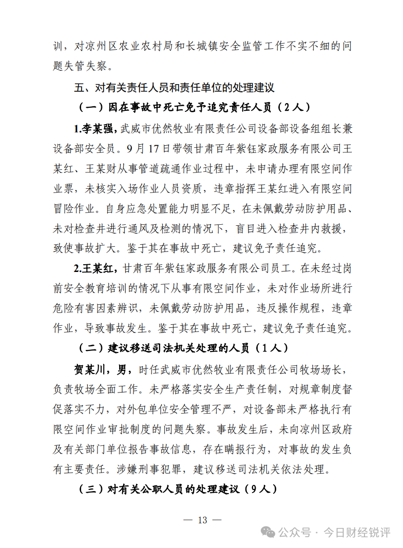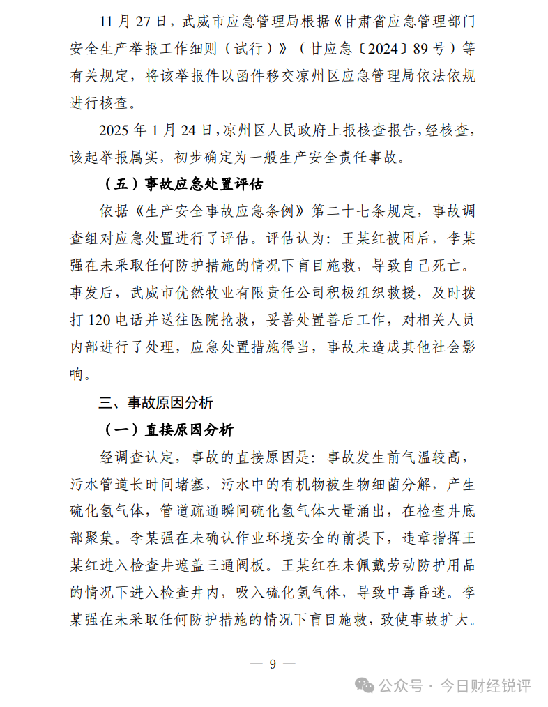 近期,关于武威市优然牧业有限责任公司瞒报的一起生产安全责任事故,引发舆论关注。本报依据《中华人民共和国政府信息公开条例》依法向武威市应急管理局申请政务公开。武威市应急管理局7月28日收件后,于8月15日通过邮件向本报发送该《调查报告》的完整版,现向社会公布。2024 年 9 月 17 日 17 时 17 分左右,武威市优然牧业有限责任公司发生一起一般中毒和窒息事故,造成2 人死亡,直接经济损失 228.15 万元。2024 年 11 月 4 日,甘肃省应急管理厅接群众举报:“2024年 9 月 17 日下午 6 时左右,武威市凉州区长城镇优然牧业两名员工进入污水池作业前,未监测有毒有害气体,导致两名员工中毒窒息死亡。该起事故未报告、未处理。”甘肃省应急管理厅将该举报件转交武威市应急管理局核查。武威市安全生产委员会办公室将该举报件函告凉州区人民政府进行核查,经凉州区人民政府核查,该举报属实。2025 年2 月5 日,甘肃省安全生产委员会办公室下发《关于武威凉州“9·17”瞒报事故挂牌督办的函》对该起事故挂牌督办,要求成立市级事故调查组提级调查。依据《中华人民共和国安全生产法》《生产安全事故报告和调查处理条例》(国务院令第493 号)等相关法律法规规定,2025 年 2 月 11 日,市政府成立了由市委常委、常务副市长华伟任组长,市应急局、市公安局、市农业农村局、市人社局、市总工会等部门有关负责同志为成员的武威凉州武威市优然牧业有限责任公司“9·17”一般中毒和窒息事故调查组(以下简称事故调查组),对该起事故实施提级调查,并邀请市检察院派员参与事故调查。同时,聘请有关专家参加。市纪委监委成立追责问责审查调查组,同步开展追责问责审查调查。按照“科学严谨、依法依规、实事求是、注重实效”和“四不放过”的原则,事故调查组通过查阅资料、座谈交流、询问谈话、现场勘验、检测鉴定、专家论证等方式方法,查清了事故经过、发生原因、人员伤亡、直接经济损失和有关单位情况,认定了事故性质、事故有关单位和人员的责任,查明了有关部门和地方在监管方面存在的问题,总结分析了事故主要教训,提出了整改和防范措施建议。 经调查认定,武威凉州武威市优然牧业有限责任公司“9·17”中毒和窒息事故是一起因违章指挥、违章作业、盲目施救而导致的一般生产安全责任事故,此事故为瞒报事故。一、事故基本情况 (一)事故发生单位概况 1.武威市优然牧业有限责任公司。法定代表人:许某飞,类型:有限责任公司(非自然人投资或控股的法人独资),注册 日 期 : 2019 年 9 月 20 日,统一社会信用代码:91620602MA71HHU35B,经营场所:甘肃省武威市凉州区长城镇长城村,经营范围:动物饲养;动物及副产品销售;生鲜乳生产及销售(取得许可证后方可经营);农副产品的收购及销售(粮食除外);饲料牧草种植、收购及销售;饲料的生产与销售;有机肥料的生产与销售;农牧业机械租赁;农牧业服务,农牧业咨询服务等。 2.甘肃百年紫钰家政服务有限公司。法定代表人:王某维,类型:有限责任公司(自然人独资),注册日期:2018年4月2 日,统一社会信用代码:91620602MA7435TY69,经营场所:甘肃省武威市凉州区南关西路 146 号,经营范围:居民日常生活服务;养老服务;机构养老服务;家政服务;建筑物清洁服务;专业保洁、清洗、消毒服务;总质量4.5 吨及以下普通货运车辆道路货物运输(除网络货运和危险货物)等。(二)事故发生单位安全管理情况1.武威市优然牧业有限责任公司。法人代表许某飞,实际不参与牧场日常管理工作;时任牧场场长贺某川负责牧场全面工作;副场长杨某铂分管牧场设备部、挤奶部、饲养部、后勤部工作;安全经理赵某文负责牧场安全管理工作;时任设备部经理田某生负责设备部工作;设备部设备组组长李某强(兼设备部安全员)负责安全设施设备维修工作;设备部设备组组长杨某华负责环保设备维修工作。公司建立了安全生产责任制,制定了各项安全生产管理制度,以及危险作业安全管理规定。2.甘肃百年紫钰家政服务有限公司。法定代表人王某维负责公司全面工作,公司未建立安全生产责任制,未配备专职或兼职安全生产管理人员,安全生产各项管理制度不健全,未对从业人员进行安全生产教育培训。2023 年 8 月 27 日,武威市优然牧业有限责任公司(甲方)通过招标方式与甘肃百年紫钰家政服务有限公司(乙方)签订《管道疏通服务合同》,服务期限至2024 年8 月26日,并签订了《相关方安全协议书》。2024 年8 月26 日,甲乙双方又签订了《补充协议书》,约定服务期限延长至2024 年9月26日。(三)事故发生经过 2024 年 9 月 16 日,武威市优然牧业有限责任公司发现排污管道堵塞,设备部经理田某生联系甘肃百年紫钰家政服务有限公司进行疏通,但甘肃百年紫钰家政服务有限公司未前去疏通。9 月 17 日 09 时左右,武威市优然牧业有限责任公司设备部设备组组长杨某华给甘肃百年紫钰家政服务有限公司负责人王某维打电话要求派人疏通管道。王某维接到电话后,安排公司司机王某财和工人王某红前往武威市优然牧业有限责任公司疏通管道。 11 时 10 分,王某财驾驶吸污车载王某红到达武威市优然牧业有限责任公司门口,拨打杨某华电话准备进入场区,杨某华协调设备部设备组组长李某强(兼设备部安全员)前往公司门口将王某财、王某红 2 人接进公司。进入公司后,