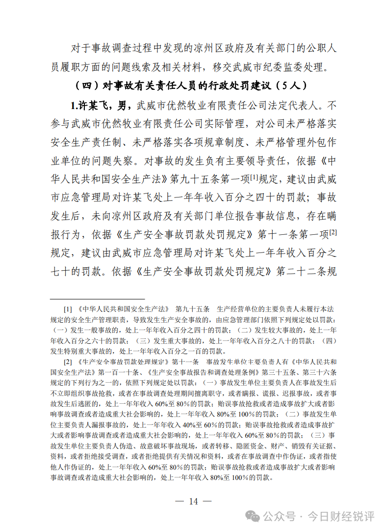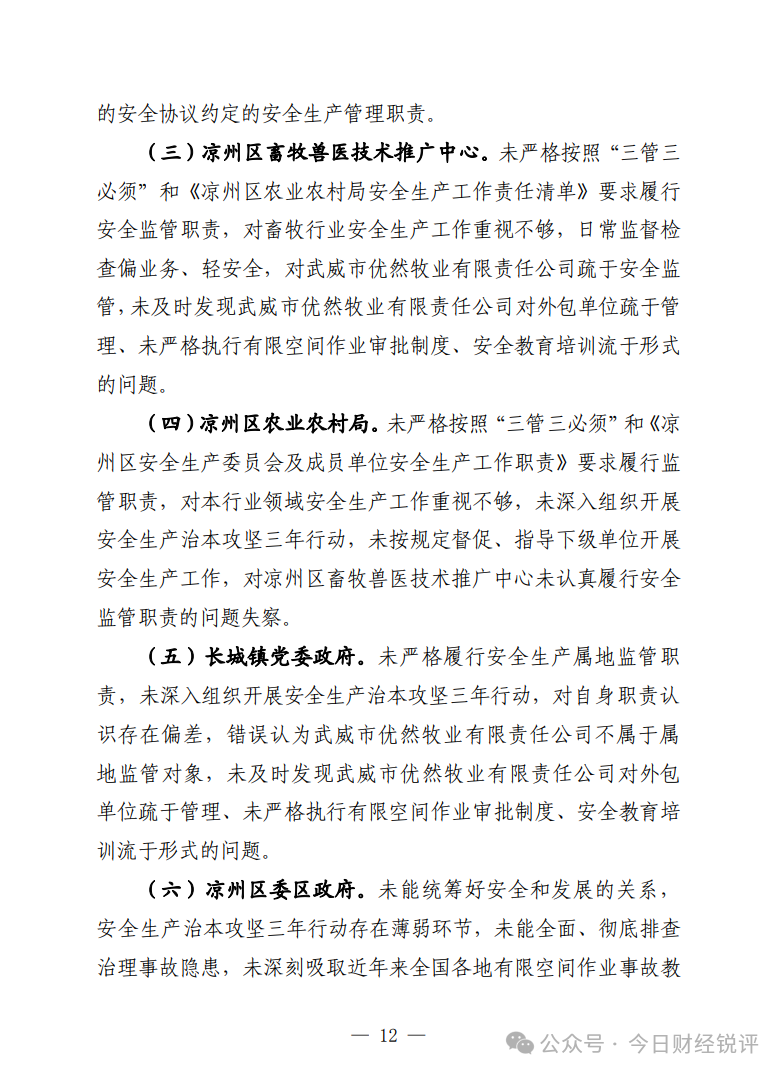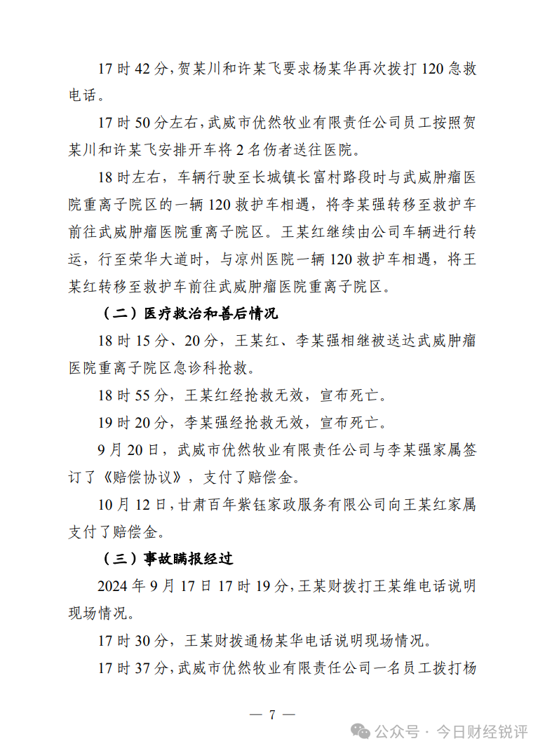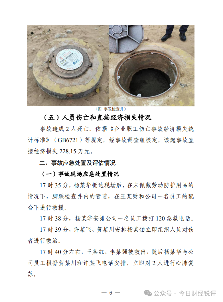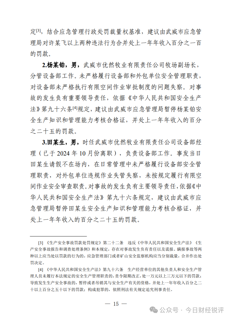 近期,关于武威市优然牧业有限责任公司瞒报的一起生产安全责任事故,引发舆论关注。本报依据《中华人民共和国政府信息公开条例》依法向武威市应急管理局申请政务公开。武威市应急管理局7月28日收件后,于8月15日通过邮件向本报发送该《调查报告》的完整版,现向社会公布。2024 年 9 月 17 日 17 时 17 分左右,武威市优然牧业有限责任公司发生一起一般中毒和窒息事故,造成2 人死亡,直接经济损失 228.15 万元。2024 年 11 月 4 日,甘肃省应急管理厅接群众举报:“2024年 9 月 17 日下午 6 时左右,武威市凉州区长城镇优然牧业两名员工进入污水池作业前,未监测有毒有害气体,导致两名员工中毒窒息死亡。该起事故未报告、未处理。”甘肃省应急管理厅将该举报件转交武威市应急管理局核查。武威市安全生产委员会办公室将该举报件函告凉州区人民政府进行核查,经凉州区人民政府核查,该举报属实。2025 年2 月5 日,甘肃省安全生产委员会办公室下发《关于武威凉州“9·17”瞒报事故挂牌督办的函》对该起事故挂牌督办,要求成立市级事故调查组提级调查。依据《中华人民共和国安全生产法》《生产安全事故报告和调查处理条例》(国务院令第493 号)等相关法律法规规定,2025 年 2 月 11 日,市政府成立了由市委常委、常务副市长华伟任组长,市应急局、市公安局、市农业农村局、市人社局、市总工会等部门有关负责同志为成员的武威凉州武威市优然牧业有限责任公司“9·17”一般中毒和窒息事故调查组(以下简称事故调查组),对该起事故实施提级调查,并邀请市检察院派员参与事故调查。同时,聘请有关专家参加。市纪委监委成立追责问责审查调查组,同步开展追责问责审查调查。按照“科学严谨、依法依规、实事求是、注重实效”和“四不放过”的原则,事故调查组通过查阅资料、座谈交流、询问谈话、现场勘验、检测鉴定、专家论证等方式方法,查清了事故经过、发生原因、人员伤亡、直接经济损失和有关单位情况,认定了事故性质、事故有关单位和人员的责任,查明了有关部门和地方在监管方面存在的问题,总结分析了事故主要教训,提出了整改和防范措施建议。 经调查认定,武威凉州武威市优然牧业有限责任公司“9·17”中毒和窒息事故是一起因违章指挥、违章作业、盲目施救而导致的一般生产安全责任事故,此事故为瞒报事故。一、事故基本情况 (一)事故发生单位概况 1.武威市优然牧业有限责任公司。法定代表人:许某飞,类型:有限责任公司(非自然人投资或控股的法人独资),注册 日 期 : 2019 年 9 月 20 日,统一社会信用代码:91620602MA71HHU35B,经营场所:甘肃省武威市凉州区长城镇长城村,经营范围:动物饲养;动物及副产品销售;生鲜乳生产及销售(取得许可证后方可经营);农副产品的收购及销售(粮食除外);饲料牧草种植、收购及销售;饲料的生产与销售;有机肥料的生产与销售;农牧业机械租赁;农牧业服务,农牧业咨询服务等。 2.甘肃百年紫钰家政服务有限公司。法定代表人:王某维,类型:有限责任公司(自然人独资),注册日期:2018年4月2 日,统一社会信用代码:91620602MA7435TY69,经营场所:甘肃省武威市凉州区南关西路 146 号,经营范围:居民日常生活服务;养老服务;机构养老服务;家政服务;建筑物清洁服务;专业保洁、清洗、消毒服务;总质量4.5 吨及以下普通货运车辆道路货物运输(除网络货运和危险货物)等。(二)事故发生单位安全管理情况1.武威市优然牧业有限责任公司。法人代表许某飞,实际不参与牧场日常管理工作;时任牧场场长贺某川负责牧场全面工作;副场长杨某铂分管牧场设备部、挤奶部、饲养部、后勤部工作;安全经理赵某文负责牧场安全管理工作;时任设备部经理田某生负责设备部工作;设备部设备组组长李某强(兼设备部安全员)负责安全设施设备维修工作;设备部设备组组长杨某华负责环保设备维修工作。公司建立了安全生产责任制,制定了各项安全生产管理制度,以及危险作业安全管理规定。2.甘肃百年紫钰家政服务有限公司。法定代表人王某维负责公司全面工作,公司未建立安全生产责任制,未配备专职或兼职安全生产管理人员,安全生产各项管理制度不健全,未对从业人员进行安全生产教育培训。2023 年 8 月 27 日,武威市优然牧业有限责任公司(甲方)通过招标方式与甘肃百年紫钰家政服务有限公司(乙方)签订《管道疏通服务合同》,服务期限至2024 年8 月26日,并签订了《相关方安全协议书》。2024 年8 月26 日,甲乙双方又签订了《补充协议书》,约定服务期限延长至2024 年9月26日。(三)事故发生经过 2024 年 9 月 16 日,武威市优然牧业有限责任公司发现排污管道堵塞,设备部经理田某生联系甘肃百年紫钰家政服务有限公司进行疏通,但甘肃百年紫钰家政服务有限公司未前去疏通。9 月 17 日 09 时左右,武威市优然牧业有限责任公司设备部设备组组长杨某华给甘肃百年紫钰家政服务有限公司负责人王某维打电话要求派人疏通管道。王某维接到电话后,安排公司司机王某财和工人王某红前往武威市优然牧业有限责任公司疏通管道。 11 时 10 分,王某财驾驶吸污车载王某红到达武威市优然牧业有限责任公司门口,拨打杨某华电话准备进入场区,杨某华协调设备部设备组组长李某强(兼设备部安全员)前往公司门口将王某财、王某红 2 人接进公司。进入公司后,