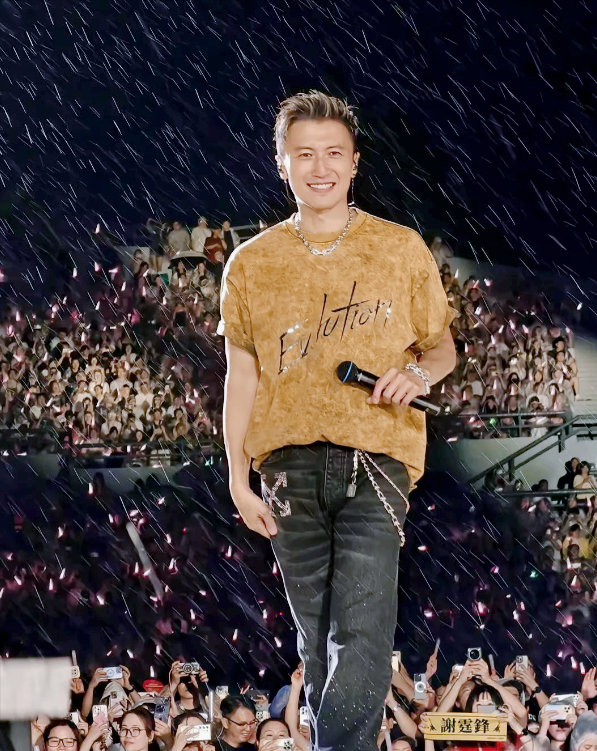 谢霆锋顶着一头白发,穿着亮黄色外套,站在暴雨里连唱《因为爱所以爱》《谢谢你的爱1999》等经典老歌。前奏一响,全场几万人直接沸腾,雨声混着合唱声,粉丝边哭边喊:“青春回来了!” 更绝的是,谢霆锋全程没提暂停,反而越唱越嗨,话筒淋得滋滋响也不影响他飙高音。