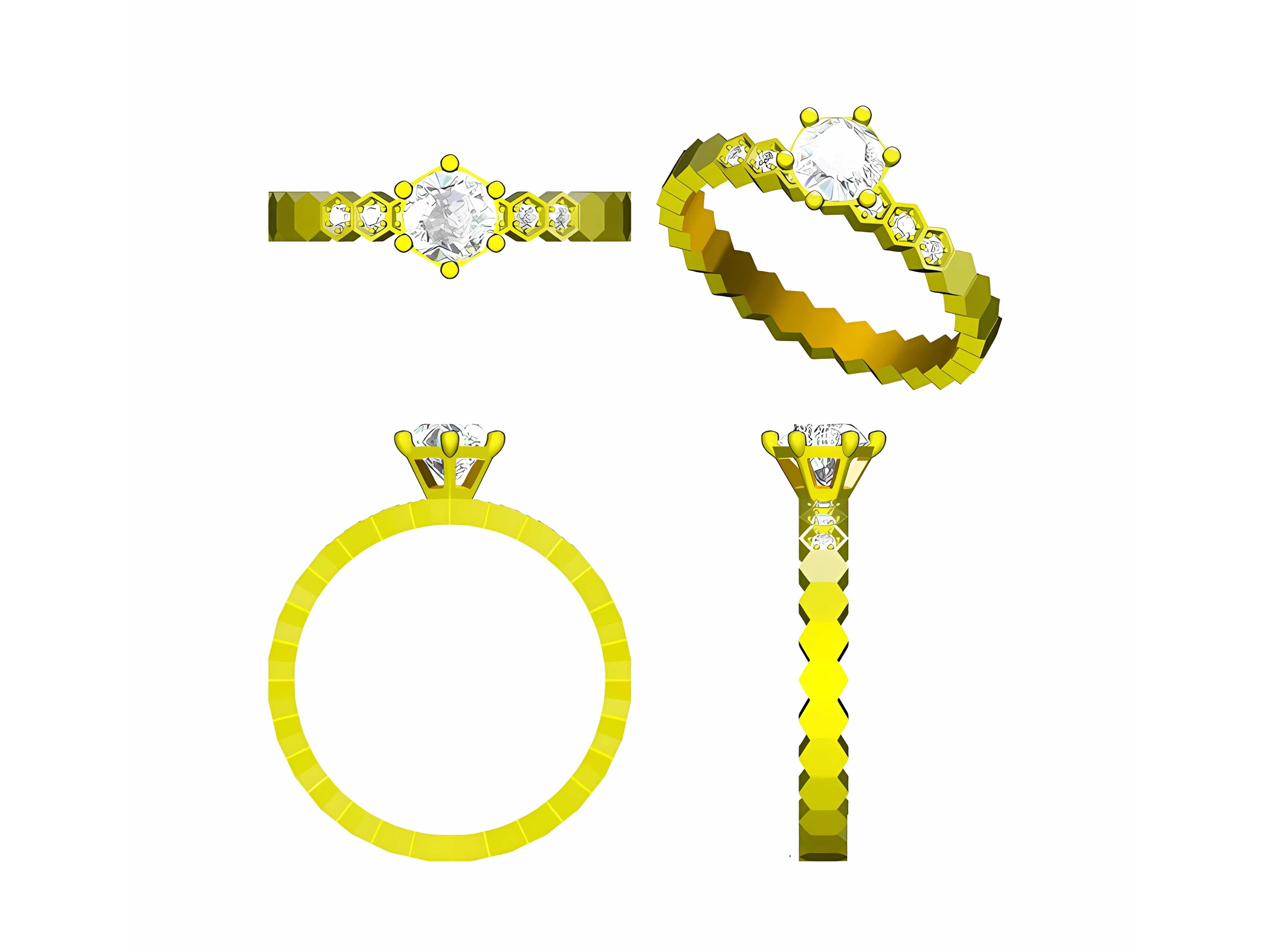 图中戒指主位上的钻石,直径达5.2mm,大小约50分。六爪的构造与蜂巢的形状相互呼应、相得益彰。轻量的爪臂最大限度减少了金属的遮挡,爪尖则以82度角护住腰棱,好似让钻石悬浮于空,在光影流转间绽放出浑然天成的美妙火彩,如同星辰般耀眼夺目。