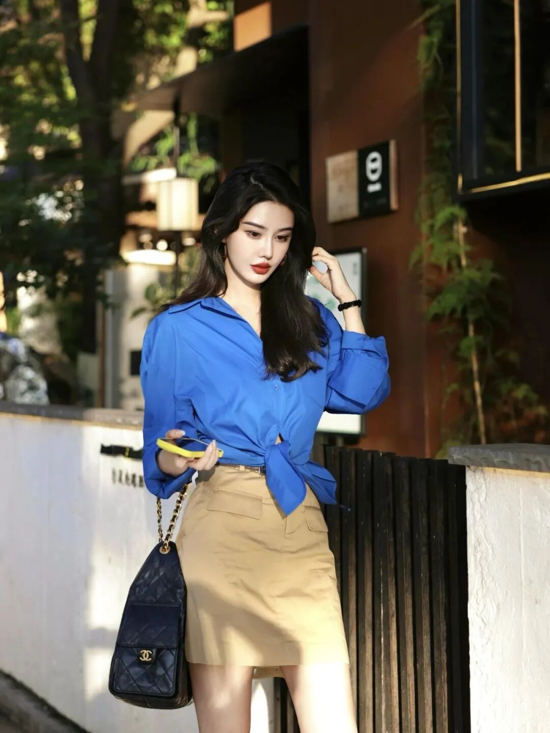坐在路边,低头专注地调整手中的包包。这个姿势能展现出一种安静又专注的美,低头的瞬间可以很好地修饰脸部线条,同时调整包包的动作让画面充满生活气息,仿佛在记录一个日常又美好的小片段,让街拍更具故事感和真实感。