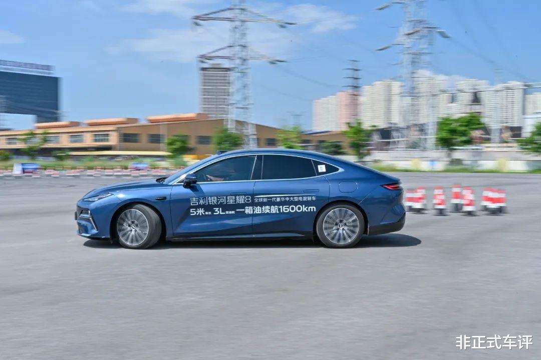 面对模拟的弯道场景,星耀8展现出了优秀的操控性能。5.2m的最小转弯半径配合FSD可变悬架,在各种弯道中有效抑制侧倾,DP-EPS转向系统反馈细腻,这种“稳而不僵”的调校,非常契合城市道路中频繁转弯、变道的驾驶需求。在直径15米的紧凑型8字弯道挑战中,得益于星耀8 EMA车身控制系统以500次/秒频率微调扭矩,后五连杆悬架高效吸收横向摆动。连续变向,其灵巧性展露无遗,再次展示了这款车在操控方面的深厚功底。