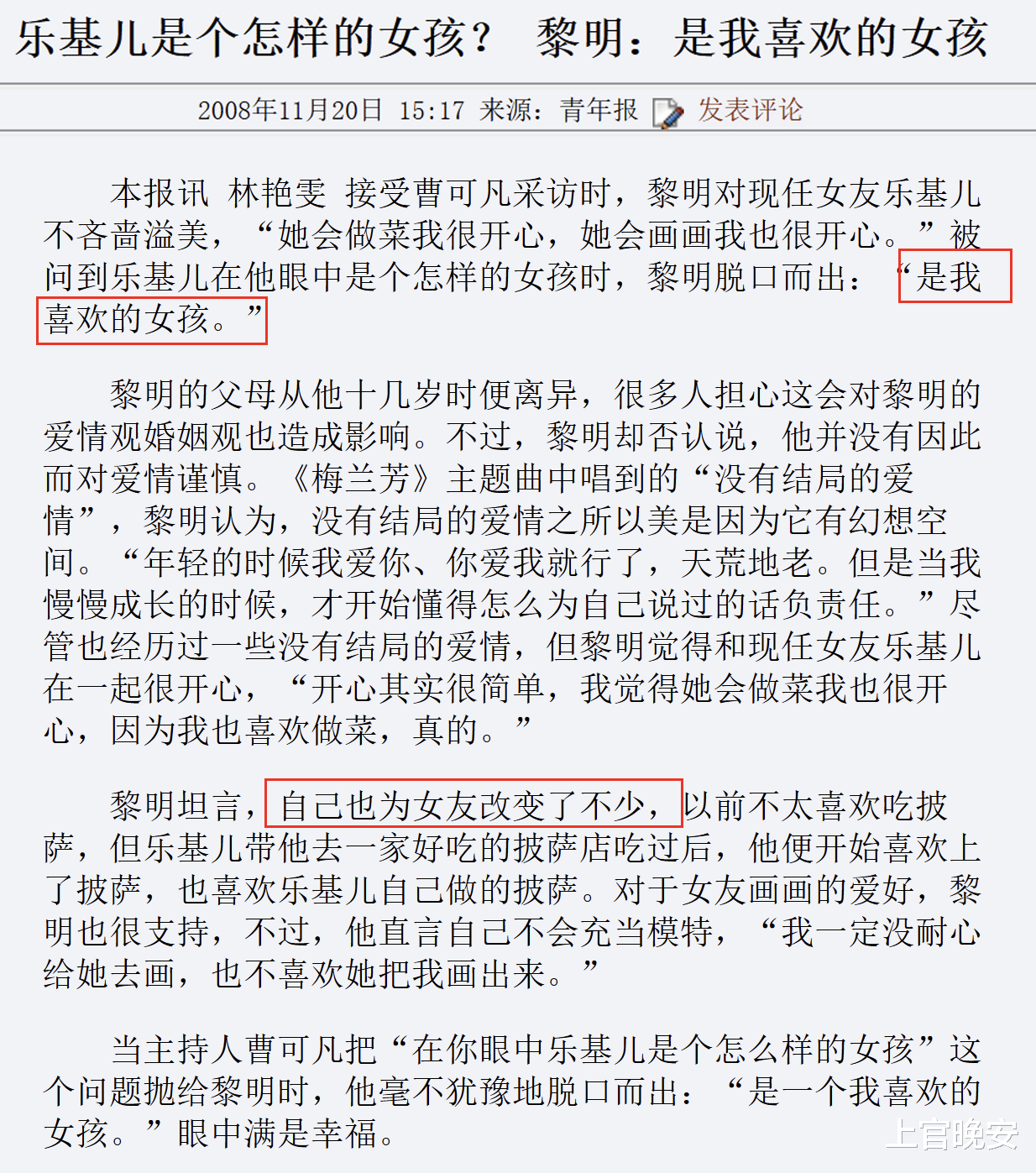 恋情被媒体拍到后黎明大方承认,公开向乐基儿示爱“乐基儿是我喜欢的女孩,我爱她的每一面,和她在一起很开心,为了她我改变了很多”,而后高调结婚。