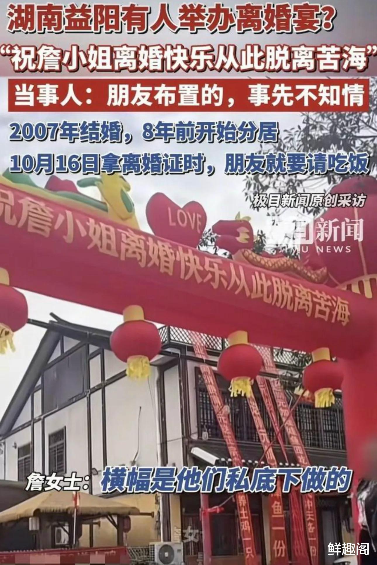 詹女士觉得离婚后就和几位闺蜜聚一聚,可是当她到达聚餐地点的时候,也被眼前的一幕震撼了。高大的拱门占了路的一半宽,四米的条幅上写着“祝詹小姐离婚快乐从此脱离苦海”。条幅两侧还写着两句祝福的话,分别是“人生处处是舞台勇敢放弃”、“重回单身从此顺风顺水”。