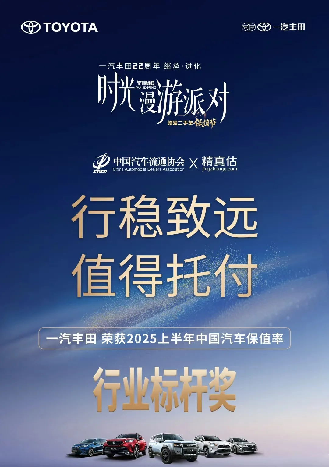 这一庞大而精细的体系不仅体现出品牌强大的渠道控制与资源整合能力,更反映出消费者对一汽丰田二手车业务的高度信赖。在中国汽车流通协会2025年上半年发布的保值率榜单中,一汽丰田荣获"中国汽车保值率行业标杆奖"。具体到车型,皇冠陆放在中型SUV保值率榜单中高居榜首,三年保值率达67.1%;亚洲龙则持续领跑中高级轿车及混动市场。