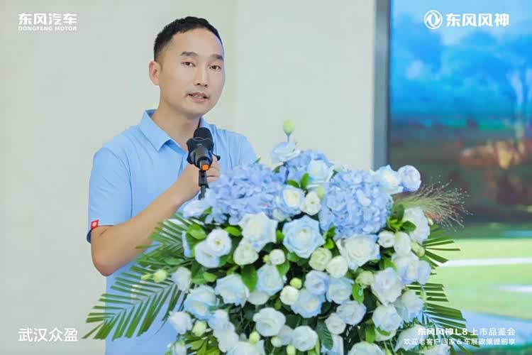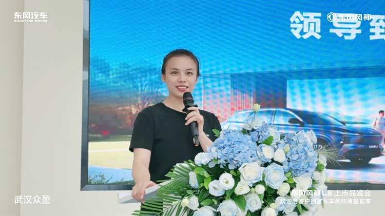 紧接着,东风风神武汉众盈4S店总经理胡盼盼女士上台致辞。领导首先对大家的到来表示诚挚感谢,随后阐述了东风风神品牌的发展理念与愿景,强调L8系列车型对于品牌的重要意义,同时也表达了对广大用户支持的感恩之情,