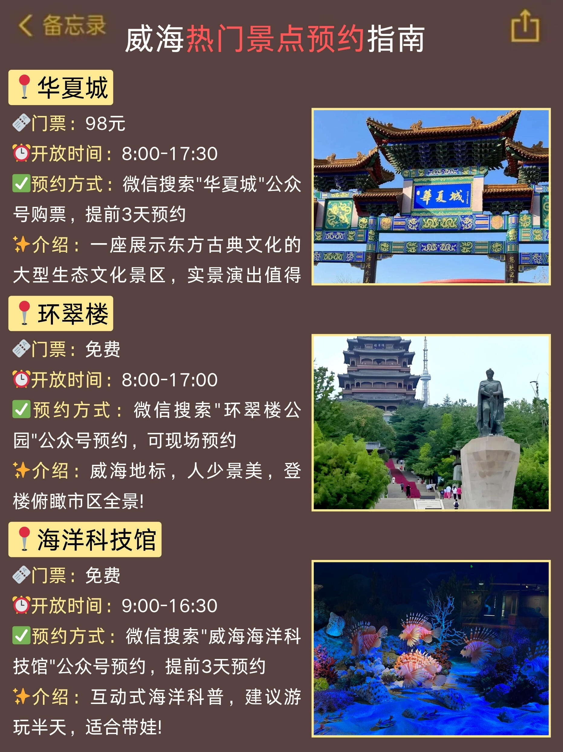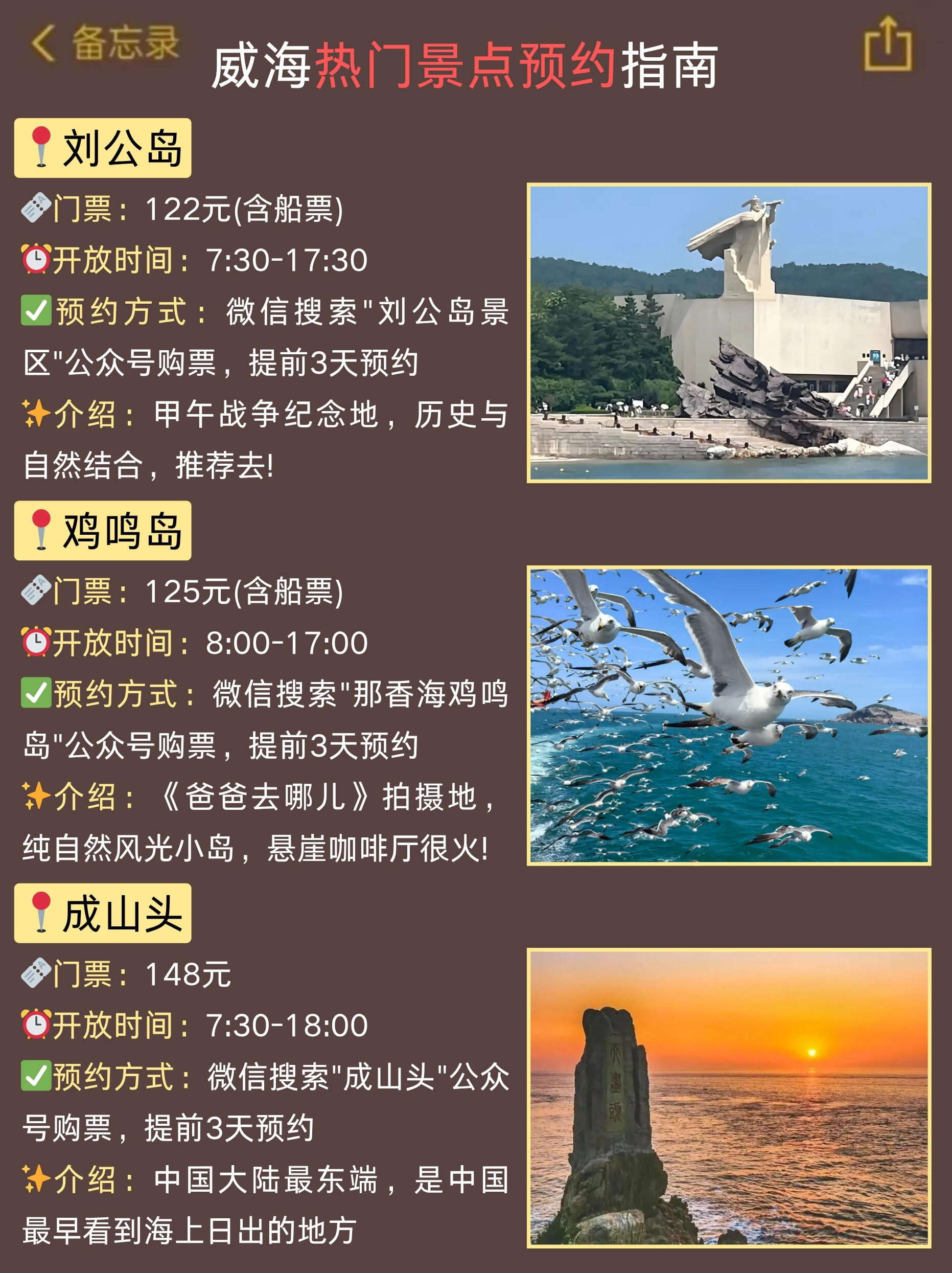 图片里整理了威海各个景点的预约时间,大家看看自己想玩的景点提前用不用预约!🔖