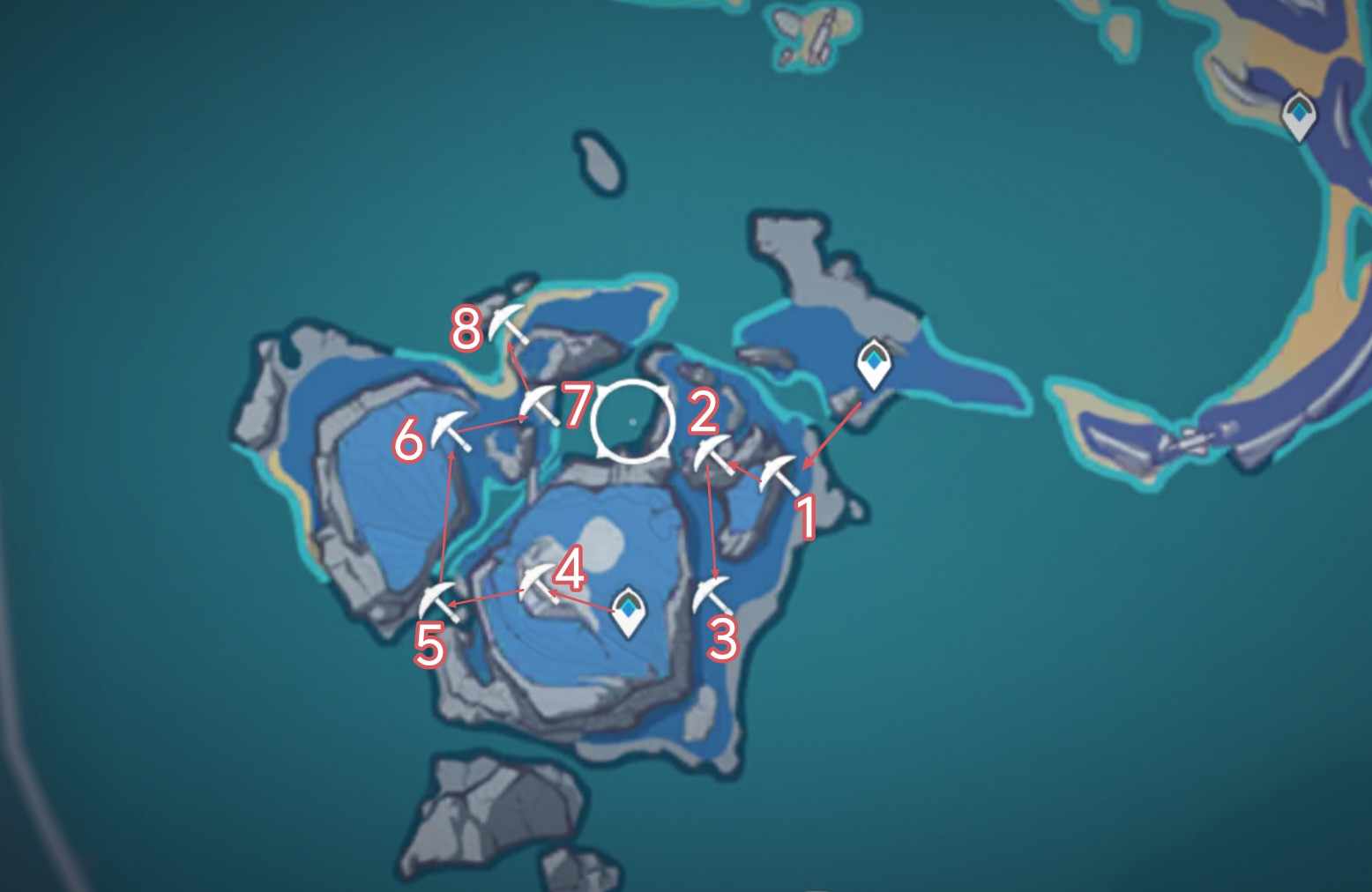 点位 14:双生礁南侧的 “环形礁”,礁湖中央的 “水纹平台” 上,需用水元素角色(如芭芭拉、绫人)攻击平台,平台升起后拾取虹滴晶。