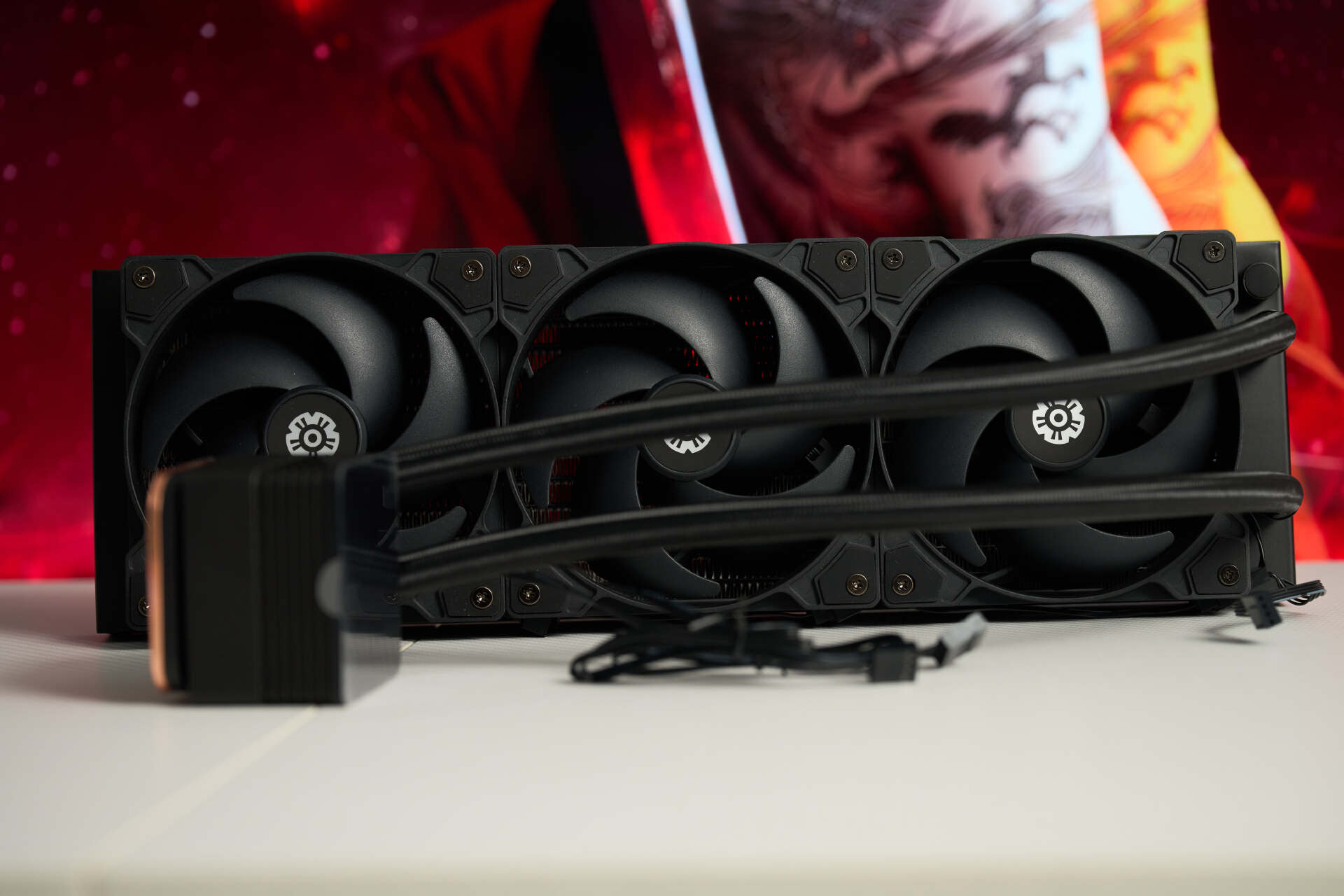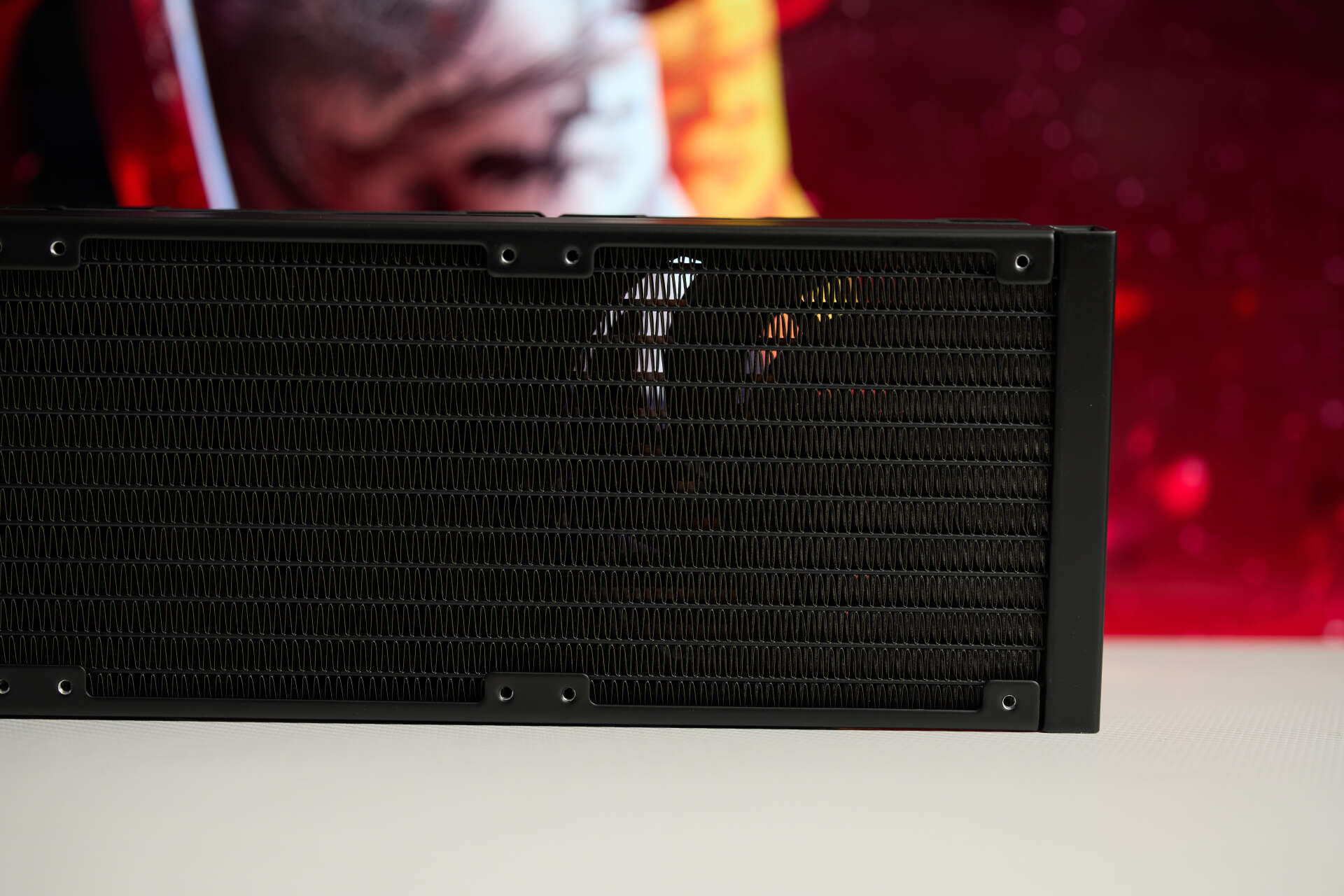 散热器采用标准 360mm 铝制冷排,内置 12 条水道,散热鳍片做工精密且排列密集。