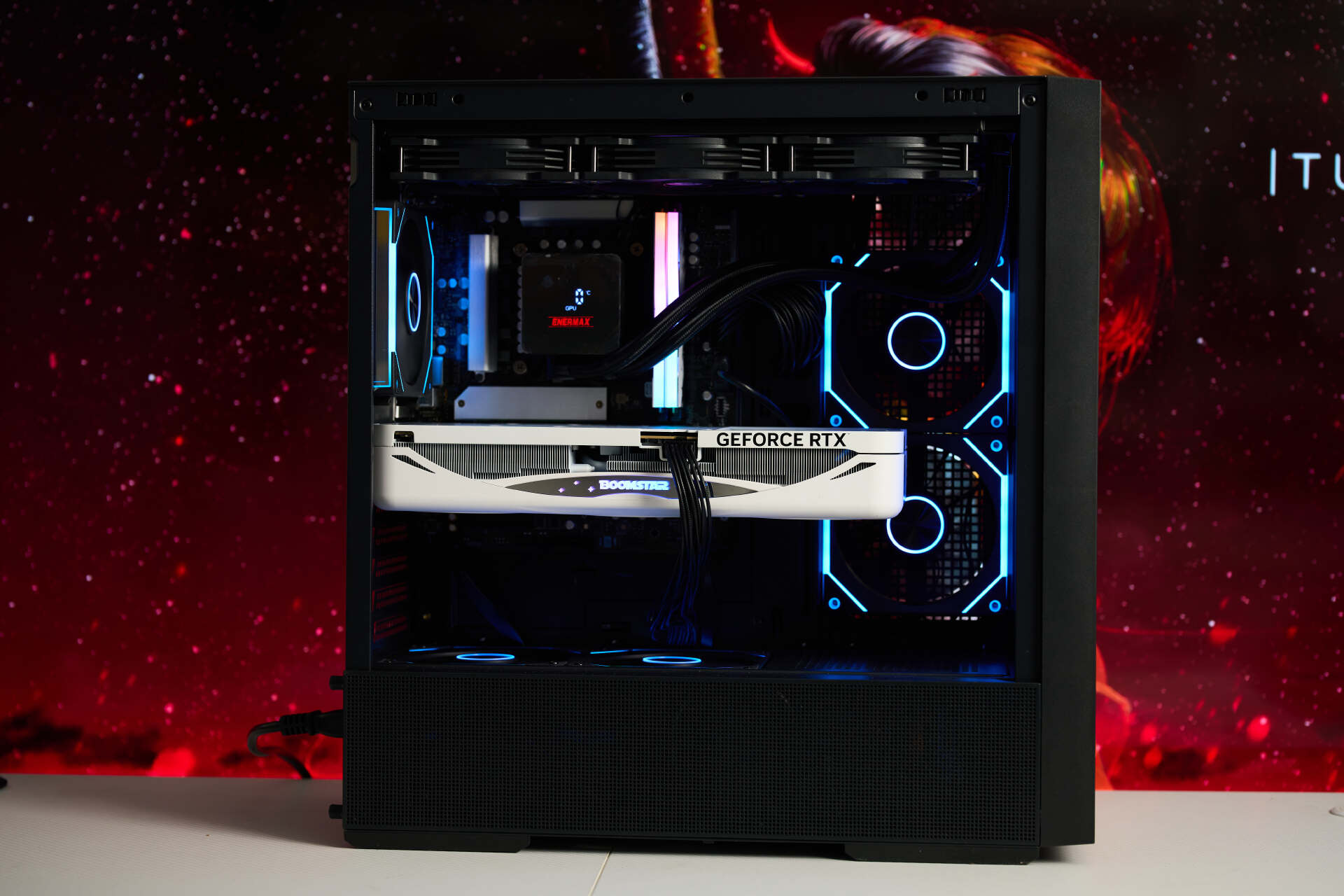 影驰 RTX 5070 Ti 星曜 LUNA OC 本身已是尺寸不小的显卡,但装入风屿 K1 机箱后,内部仍留有相当充裕的空间余度,完全没有局促拥挤的安装压力。值得一提的是,这款机箱的显卡限长达到 400mm,兼容性相当出色 —— 即便是规格更高、尺寸可能更大的 RTX 5090,也能轻松容纳其中,不用为显卡装不下的问题发愁。