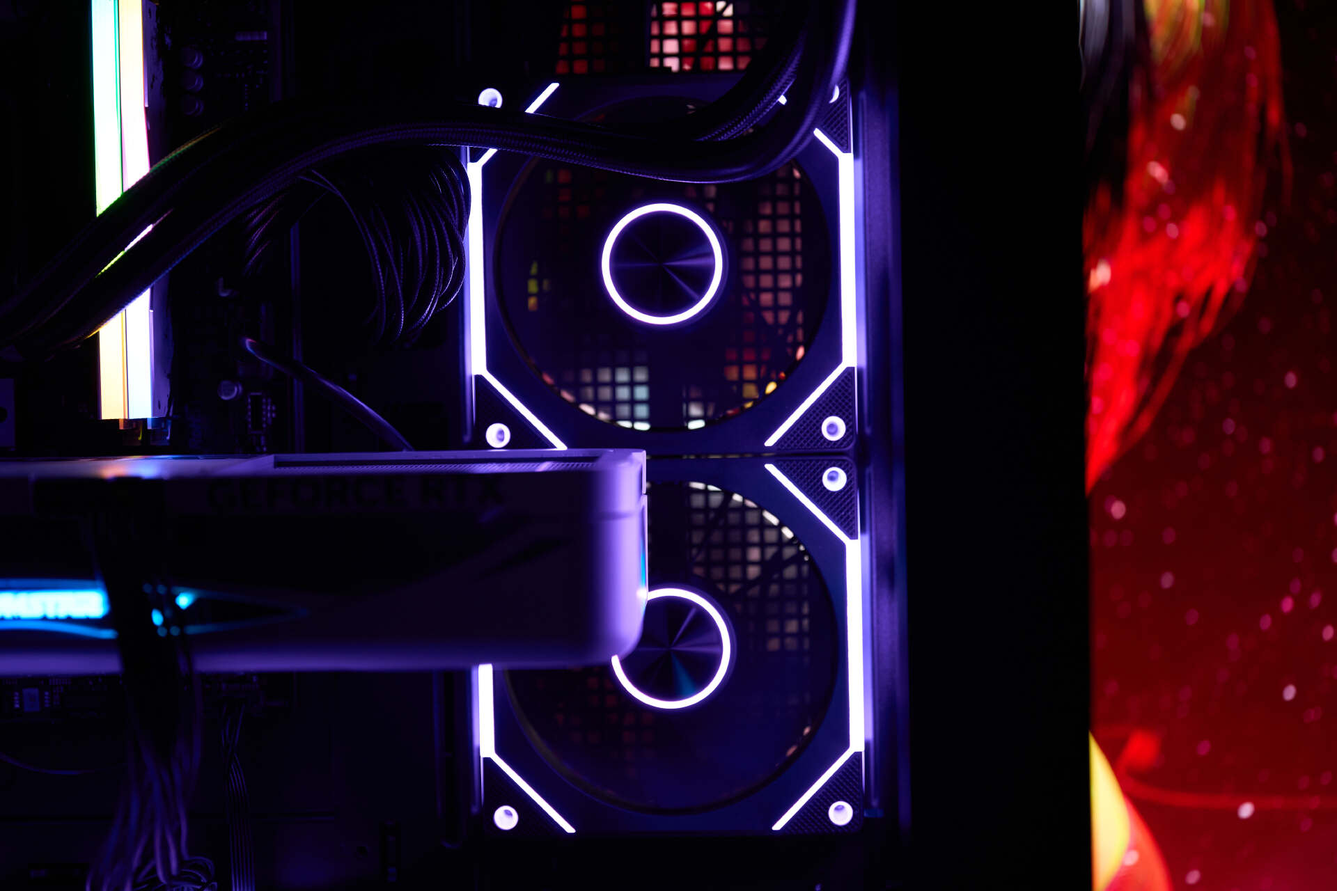 冷排预装 3 把 PWM 智能调速风扇,至高 1800RPM 转速,最大风量 58.03CFM。扇叶设计独特,3mm 厚叶片经角度优化,高风量风压下控噪显著,且风扇为无光标配。