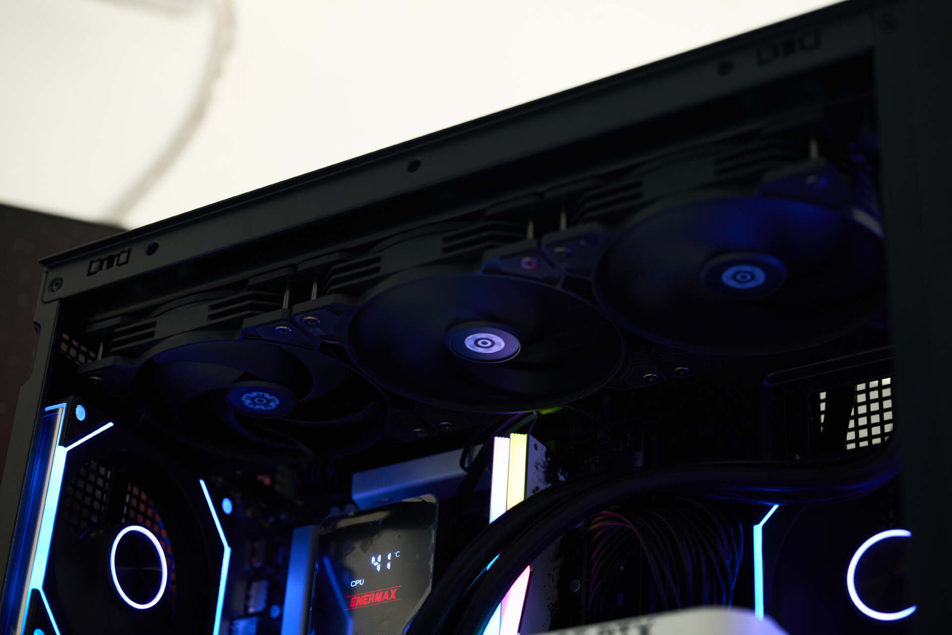 机箱顶部可安装360水冷,如果使用风冷,也可以安装3把120mm散热风扇,顶部进风或出风都可以自由选择。