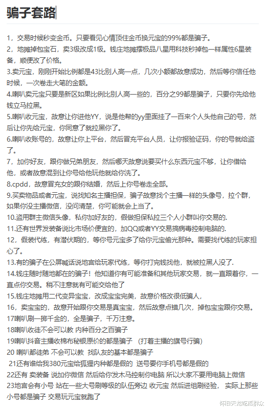 开服时还有个博主也是被骗子几个人带萌新的老手段给骗了钱去。最近也看到许多骗子,其实都是老一套,遇到天上掉馅饼的事格外小心,买卖交易前格外注意。