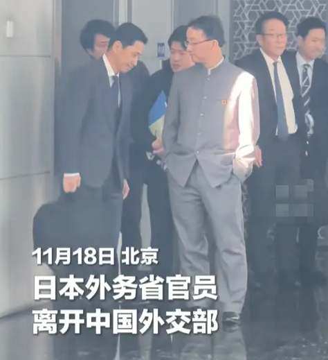 11.18日本官员离开时表情严肃 ,日本外务省,派来的亚洲大洋洲局局长,刚开完会准备离开,我们外交部亚洲司司长刘劲松,边走边跟他说着什么,金井正彰低着头,一边走一边点头,表情绷得紧紧的。刘劲松穿的是五四青年装,胸口别着国徽。这身打扮很有讲究。