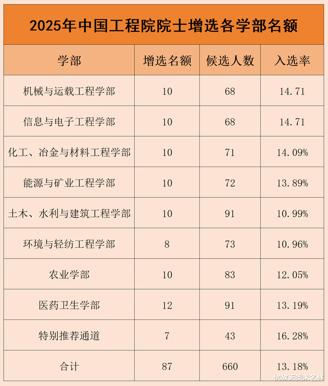 至于中国工程院院士,有效候选人有660名,计划新增87名,整体入选率为13.18%。本次计划新增数量与往届相差无几——2023年选举产生中国工程院院士74人,2021年有中国工程院院士84位、外籍院士20位。