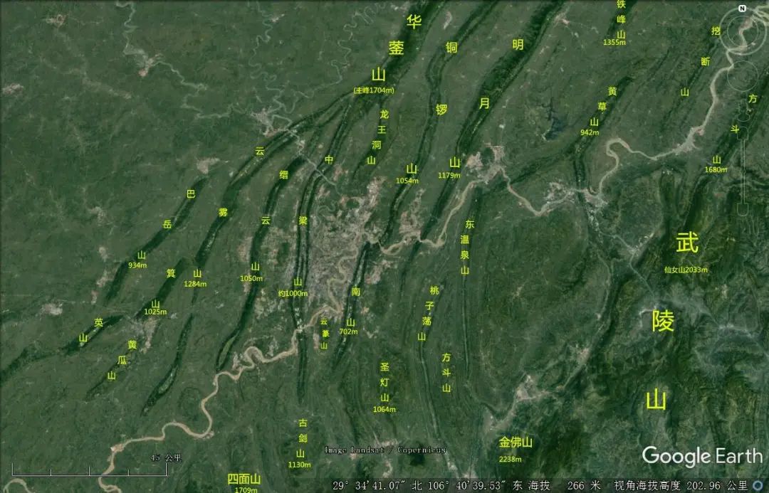 在四川盆地东部,有数十条山脉如列队士兵般整齐排列,山与山之间夹着狭长的谷地,这就是地理学上著名的"川东平行岭谷"。这片面积约5.6万平方公里的区域,从重庆主城区一直延伸到湖北边境,构成了中国最典型的褶皱山地景观。