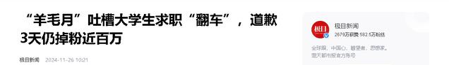 《“羊毛月”吐槽大学生求职“翻车”,道歉3天仍掉粉近百万》极目新闻 2024-11-26