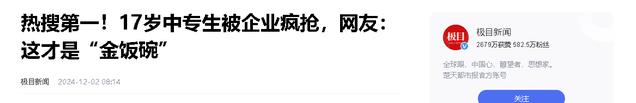 信源:《热搜第一!17岁中专生被企业疯抢,网友:这才是“金饭碗”》极目新闻2024-12-02