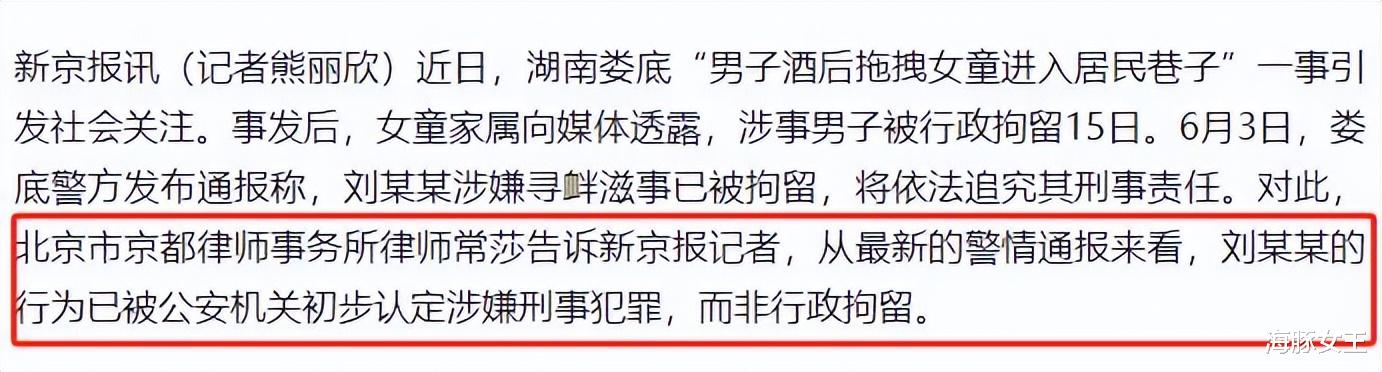 刘某某是以寻衅滋事被拘留15天,网友觉得判的太轻,刘某某拉小女孩进巷子,本来就是司马昭之心路人皆知,如果不重判公道何在?