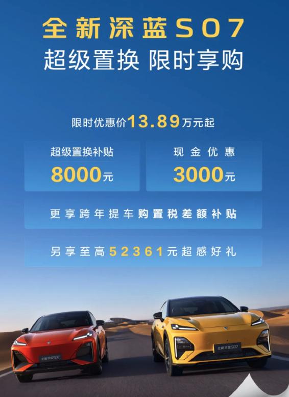 同样的全新深蓝 S07 ,也有 3000 元现金优惠 + 8000 元置换补贴 + 跨年提车购置税差额补贴,叠加至高 52361 元的超感好礼,限时优惠 13.89 万元起。
