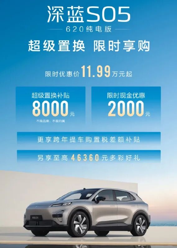 例如新款的深蓝 S05 ,也因为购车享 2000 元现金优惠 + 8000 元置换补贴 + 跨年提车购置税差额补贴;