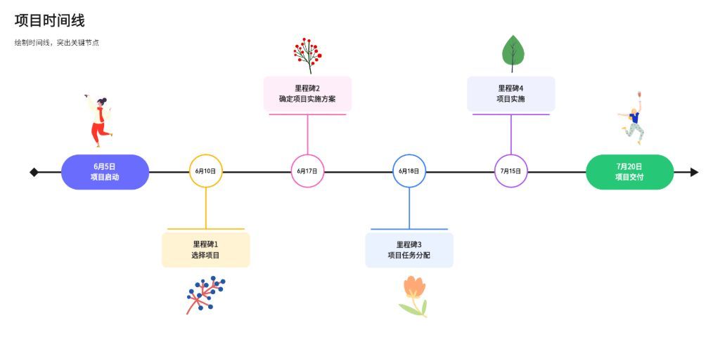 完成需求评审:这是第一个里程碑。完成 UI 设计:第二个里程碑。完成核心功能开发:第三个里程碑。正式上线:终极里程碑。