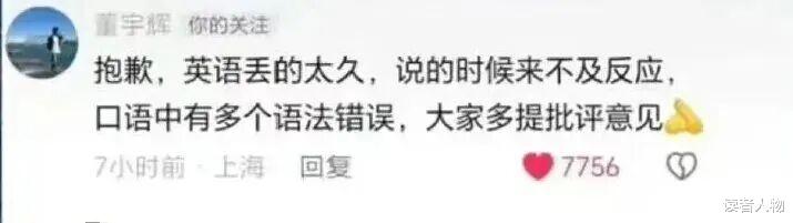 这场主动挑起来的争议很快发酵,董宇辉没有回避,在抖音评论区平静道歉:“抱歉,英语丢得太久,说的时候来不及反应,口语里有多个语法错误,大家多提批评意见。”