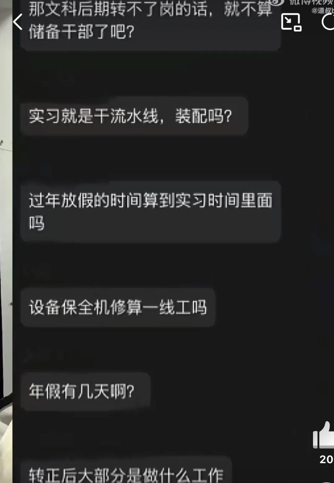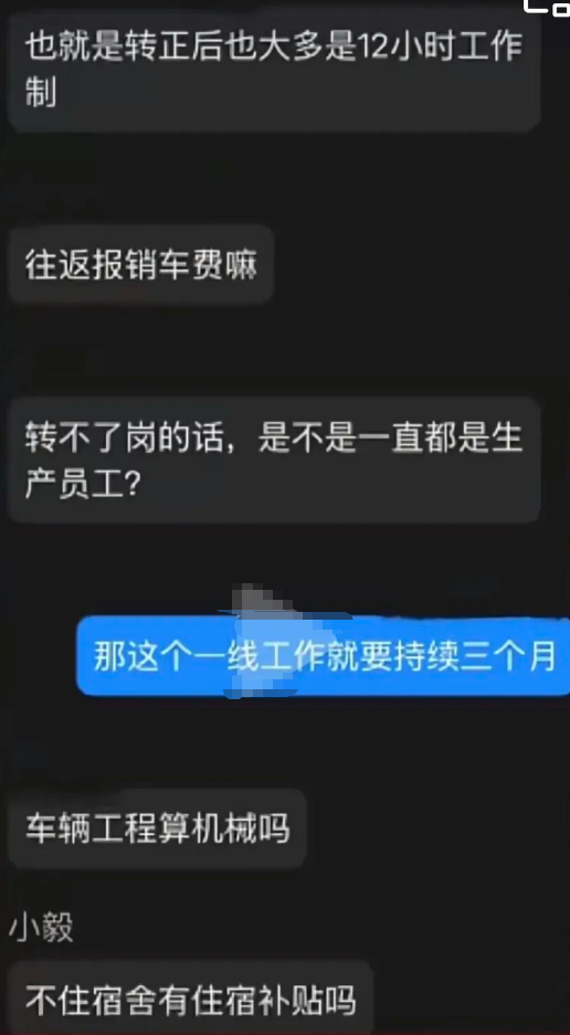 在群里,有工作人员直接说,所有准备入职的实习生需要再一线工作三个月,这些日子,每天工作12小时,早8点上班,晚8点下班,午餐给了45分钟,晚餐给了30分钟,上六休一,白班夜班一月一换。问接不接受。女生思考后,人为这些还能接受。