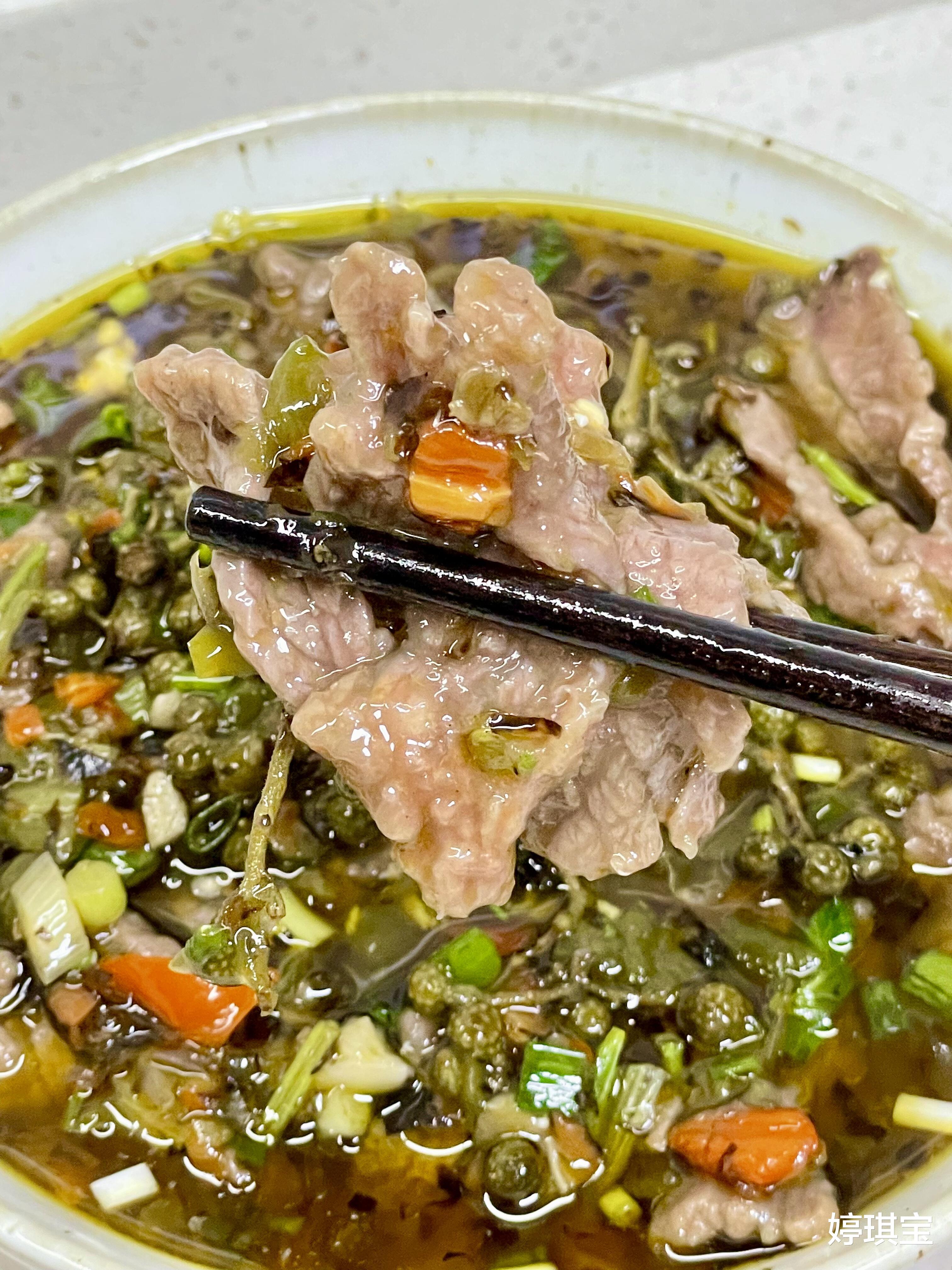 牛肉逆纹切薄片,加生抽、淀粉抓匀,最后淋花椒油锁水。腌制15分钟。