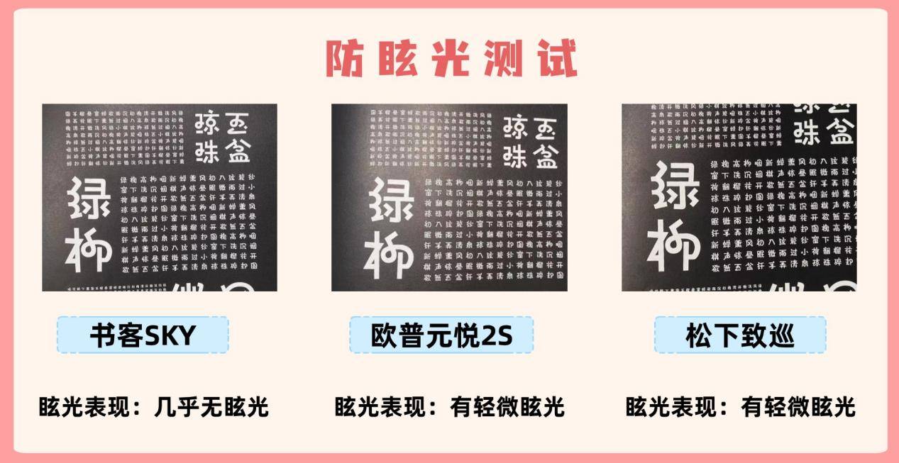 欧普元悦2S和松下致巡虽然也采用了侧发光设计,但在防眩光表现上略逊一筹,仍会出现轻微眩光。这主要是因为它们的光学处理没有像书客SKY那样做多域环控优化,所以光斑和颗粒感偶尔会被感受到。不过,轻微的眩光还是不影响日常学习的,只是与书客SKY相比稍显逊色。