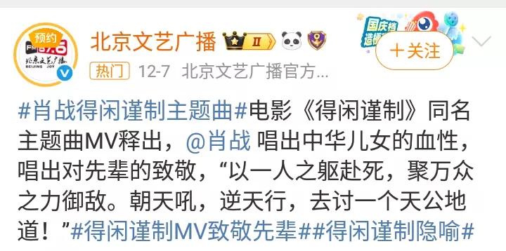 北京文艺广播在社交平台发文:“肖战唱出对先辈的致敬”。歌以咏志,乐为心声!歌曲传情达意,和电影《得闲谨制》剧情相呼应,深入人心,从而引发众多观众的共鸣!所以,看电影《得闲谨制》,不仅仅是对剧情的欣赏,还有对国家的热爱与忠诚!