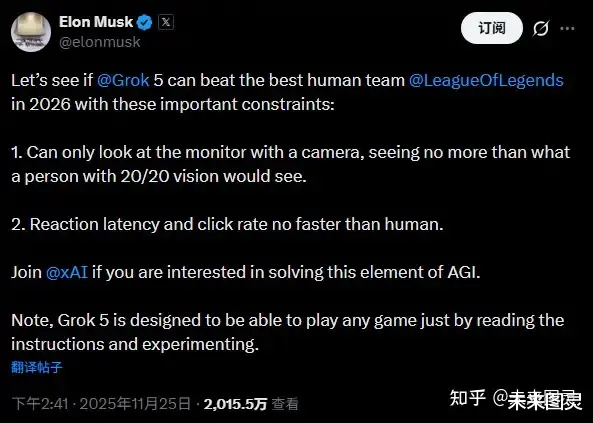 马斯克宣战:Grok 5将在2026年以纯视觉方式挑战LOL冠军T1