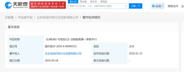 天眼查显示,2025年1月,泡泡玛特成立了电影工作室成立,并完成了《LABUBU与朋友们》动画剧本的登记,项目邀请了迪士尼动画师、皮克斯剧本顾问及Netflix亚洲团队参与,LABUBU与同系列家族大首领ZIMOMO、成员MOKOKO、TYCOCO等角色参演。