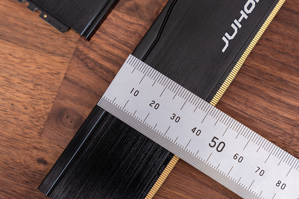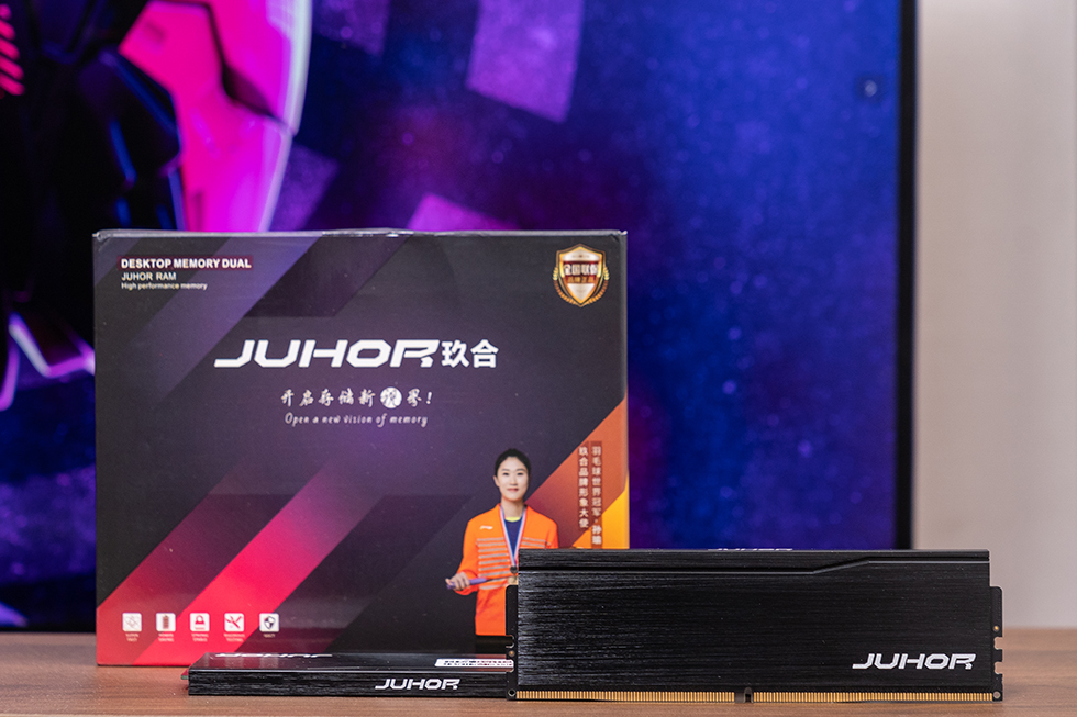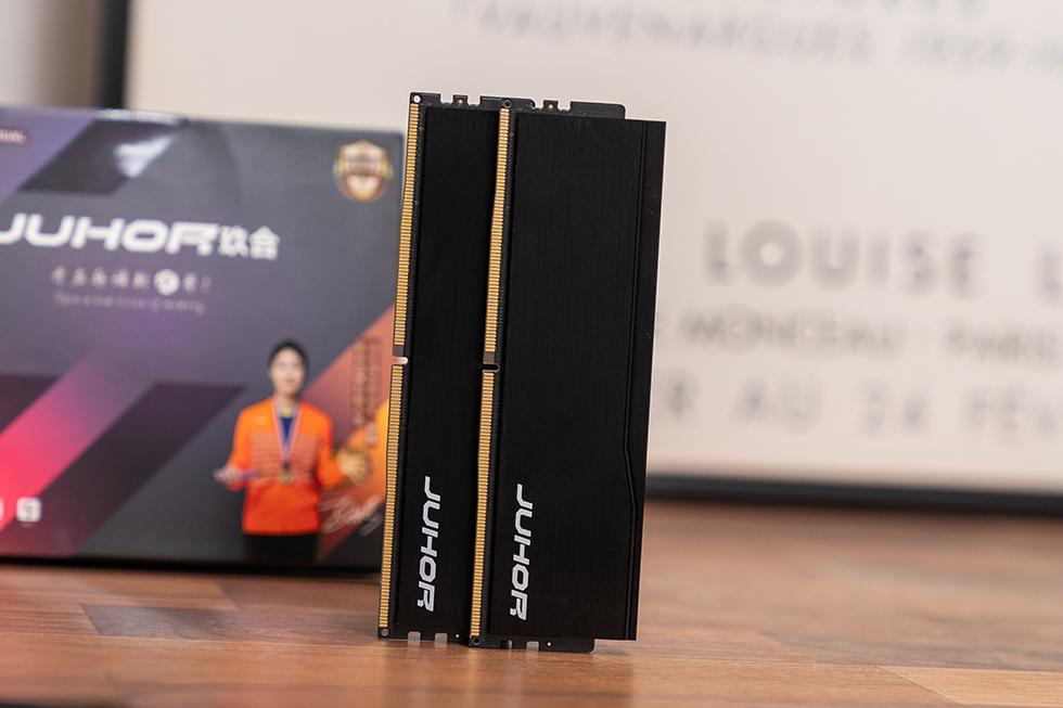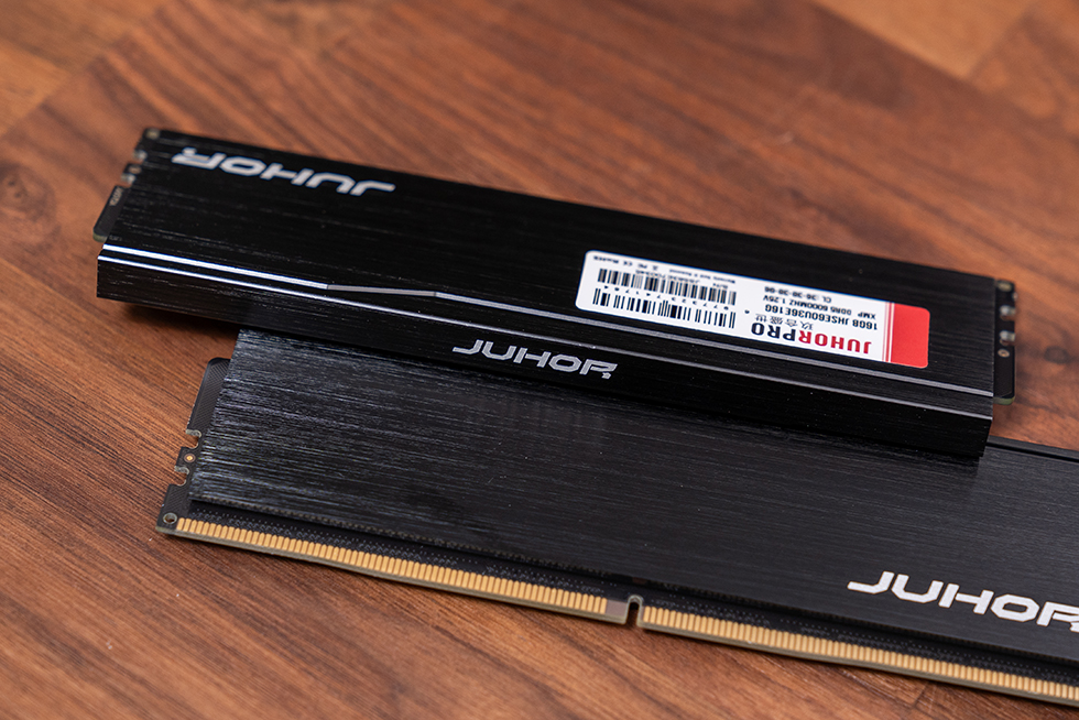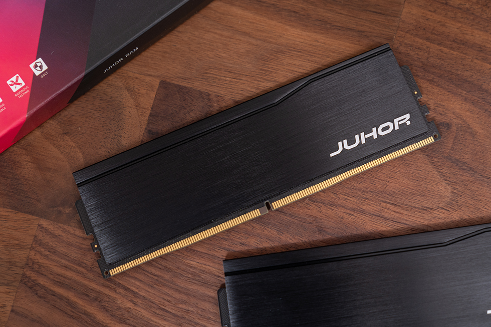 内存条主体的黑色铝合金散热马甲厚度达1.5mm,表面经过精细的拉丝处理,呈现出深邃的金属质感,触感细腻且不易留下指纹。在散热马甲的右下角位置,醒目地镶嵌着"JUHOR"品牌的白色logo标识,彰显了品牌的专业形象。