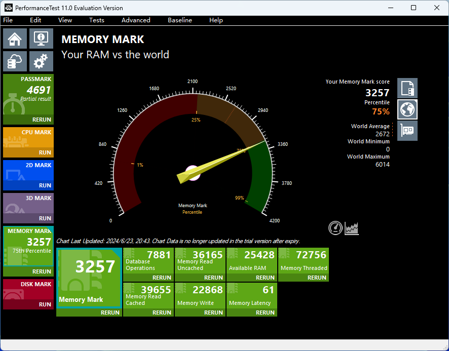 4800 MT/s(JEDEC):时序 40-40-40-77 CR1,电压 1.10V,AIDA64 内存测试读取、写入、复制以及延时的性能数据分51990 MB/s、63088 MB/s、48270 MB/s以及95.3 ns。Performance Test内存性能测试得分3257,通过7ZIP基准测试。