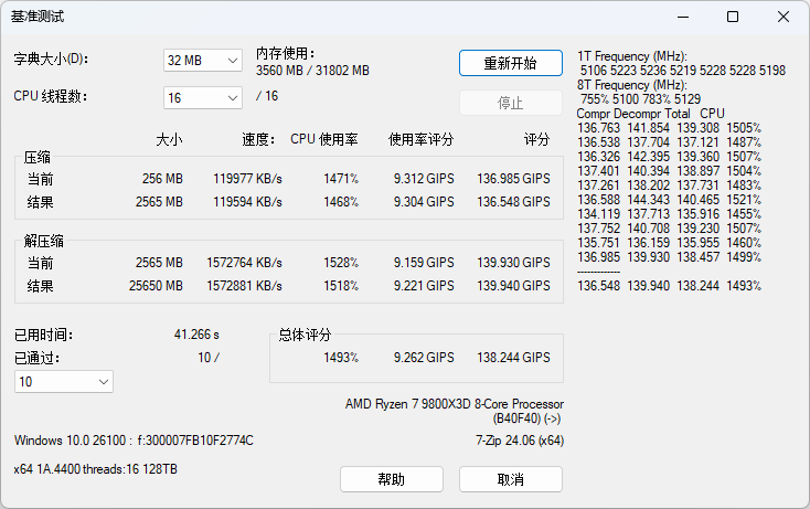 6400 MT/s(OC):进入BIOS,在保证时序 36-38-38-96 CR1,电压 1.25V不变的情况下,轻松拉升至6400 MT/s。AIDA64 内存测试读取、写入、复制以及延时的性能数据分别提升至63108 MB/s、87737 MB/s、60744 MB/s以及74.3 ns。Performance Test内存性能测试得分3864,通过7ZIP基准测试。