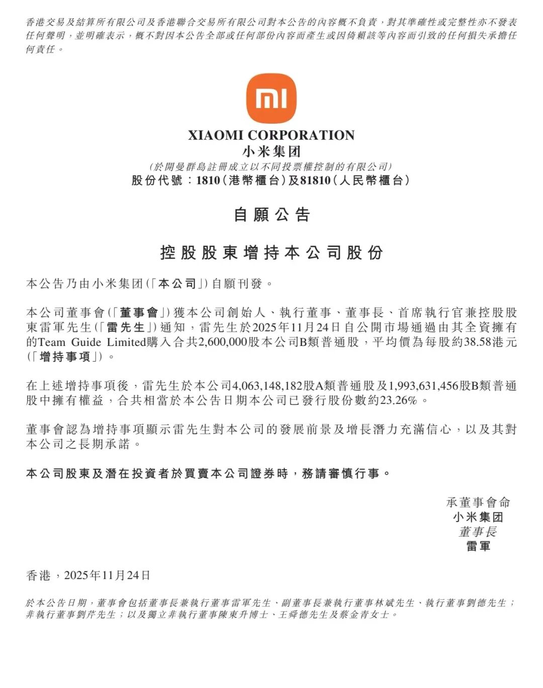 2025年11月24日,小米集团在港交所发布一则简短公告,创始人、董事长兼CEO雷军个人斥资超1亿港元增持小米集团260万股,持股比例从23.25%增至23.26%。