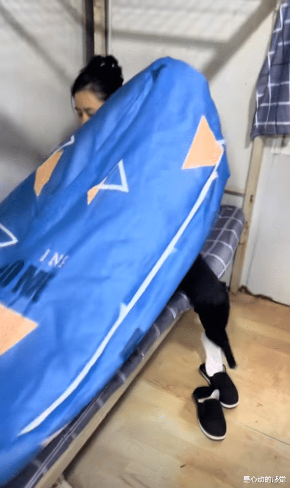 被发现之后的女子,瞬间慌乱的不知所措,整个人尴尬的是站也不是坐也不是,情急之下直接掀起旁边床上的被子钻了进去。