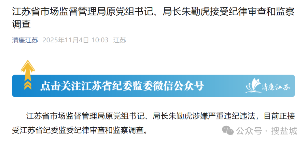 2025年11月4日,江苏省纪委监委通报,江苏省市场监督管理局原党组书记、局长朱勤虎因涉嫌严重违纪违法,正接受纪律审查和监察调查。这一消息犹如重磅炸弹,引发社会广泛热议。朱勤虎曾是江苏市场监管体系的“领航者”,如今却因违纪违法被查,这一事件不仅关乎个人命运,更折射出市场监管领域反腐的深刻内涵。