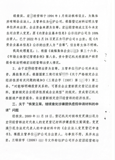 2022 年 5 月,在上级机关督促下,登记机关虽将之前错误登记某炉公司“100%出资”更正为“0出资”,但仍未按清产核资报告登记李某威等职工为出资人,反而以 “自筹” 模糊标注。“自筹主体”究竟是谁至今不明确,职工个人集资的财产权仍未得到依法登记公示。2023年,兰州市市场监管单位经调查核实,在信访复查处理意见书中,确认 “登记档案存在篡改、隐匿情况属实”。