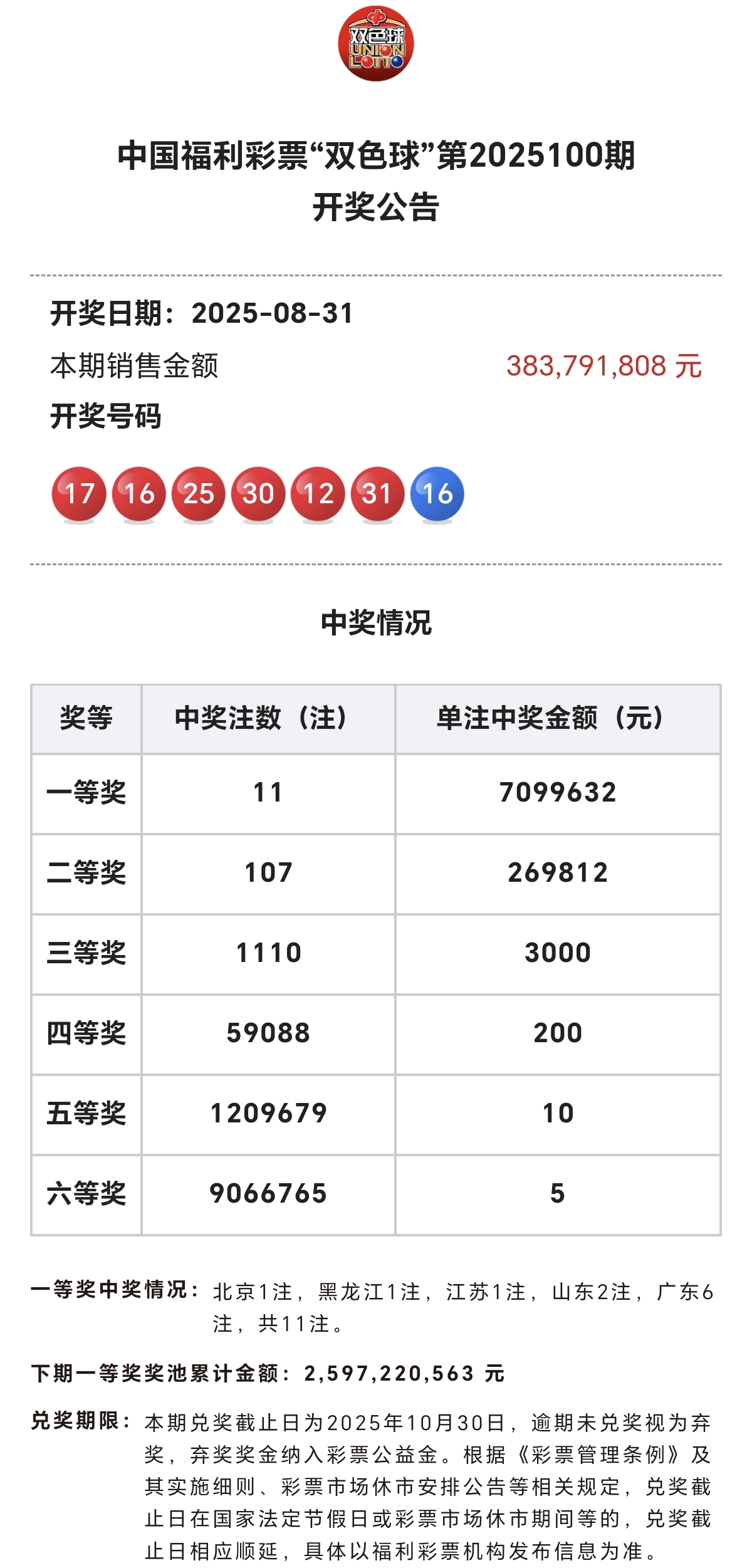 双色球2025年第100期开奖结果以及中奖情况。