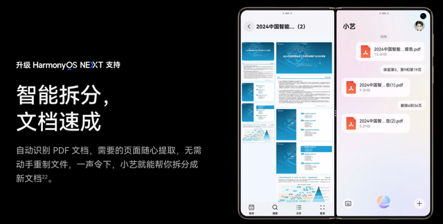 鸿蒙操作系统 5的深度赋能,让华为折叠屏的智能化体验达到新高度。将华为Mate X6等的大屏潜能充分释放,高效高能,例如处理Excel时能一键生成图表,清晰直白的显示数据;智能摘要功能可一键提取文档关键信息,大幅简化数据分析流程。更贴心的是“小艺私语”功能,在会议或图书馆等场景中,只需轻声指令即可完成邮件发送、日程提醒等操作,避免干扰他人。
