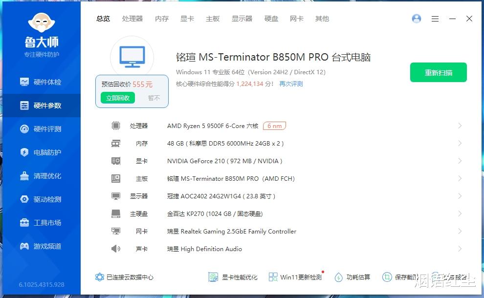 先给大家看一下我刚刚攒的电脑的详细配置,CPU是AMD锐龙5 9500F,6核12线程,最高睿频高达5.0GHz,内存为科摩思的承影机甲DDR5 6000 C28 48GB(24×2)内存套条,硬盘为1T SSD固态硬盘。